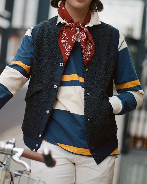 Для создания безупречного многослойного образа в духе Лиги Плюща (Ivy League style) носите регбийку поверх сорочки из ткани оксфорд с воротником button-down (по желанию ансамбль можно дополнить галстуком, будет уместным галстук в полковую полоску из шелка репс — его фактура идеально гармонирует с плотным хлопком).В прохладную погоду отличным решением станет плотный кардиган с шалевым воротником, надетый поверх регбийки — это классический прием, добавляющий образу уютной фактурности и интеллектуального шарма. Дополните комплект брюками чинос или фланелевыми брюками.
