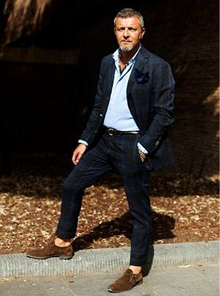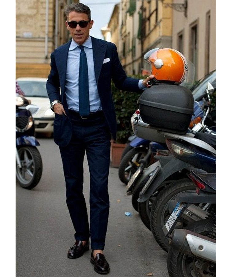 Так, вы можете надеть тёмно-синие брюки с рыже-коричневыми туфлями и тёмно-коричневым ремнём; образ получится гармоничным и достаточно сдержанным. Разумеется, рыже-коричневый ремень здесь тоже будет уместен, однако имейте в виду, что он привлечёт внимание к вашей талии. Даже если она у вас стройная, нужно ли вам это?... и нужно ли вносить в образ дополнительный яркий акцент, особенно если речь идёт о деловой одежде? Джастин Фитцпатрик, который ведёт блог The Shoe Snob, полагает, что нет – и пишет, что «если вы намерены надеть достаточно броские туфли, вам не следует подбирать к ним ремень точно такого же цвета, потому что в результате картина получится слишком напряжённой для глаз. Синий костюм с рыжими туфлями и рыжим ремнём – это перебор; такой образ как будто кричит «Посмотри на меня!»[4].