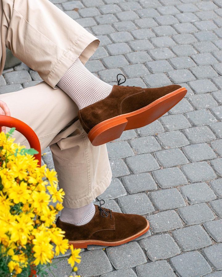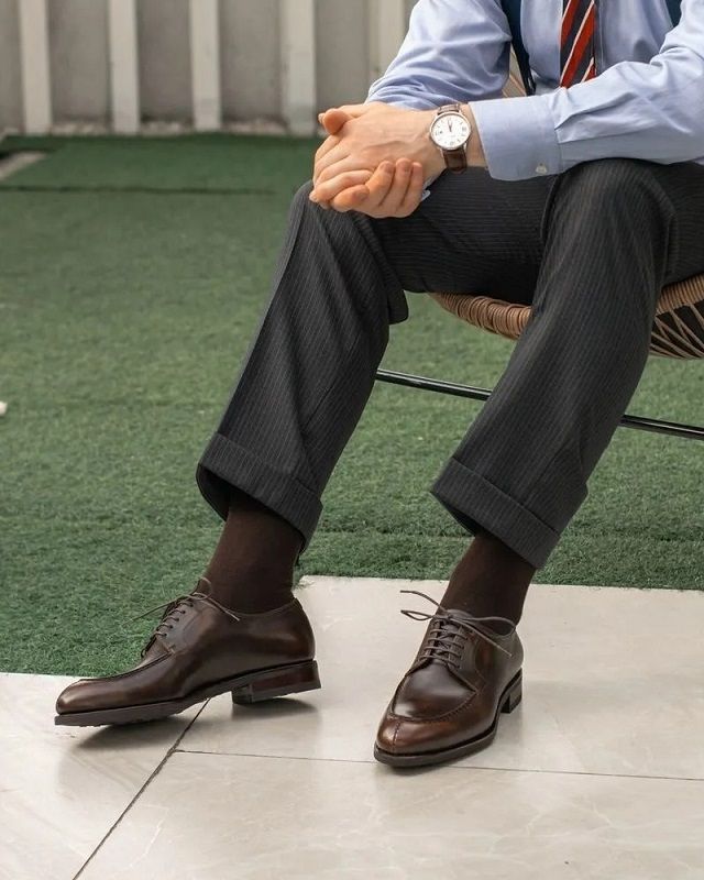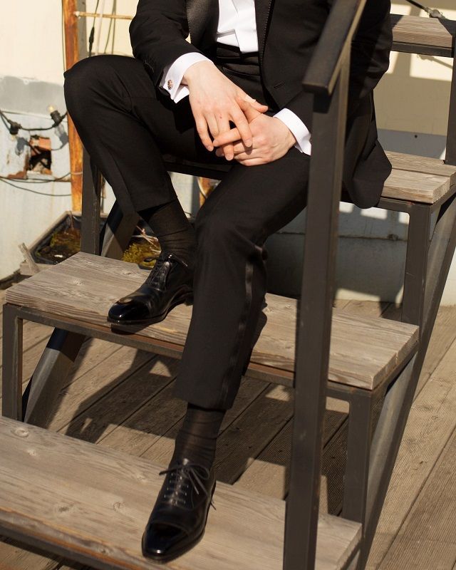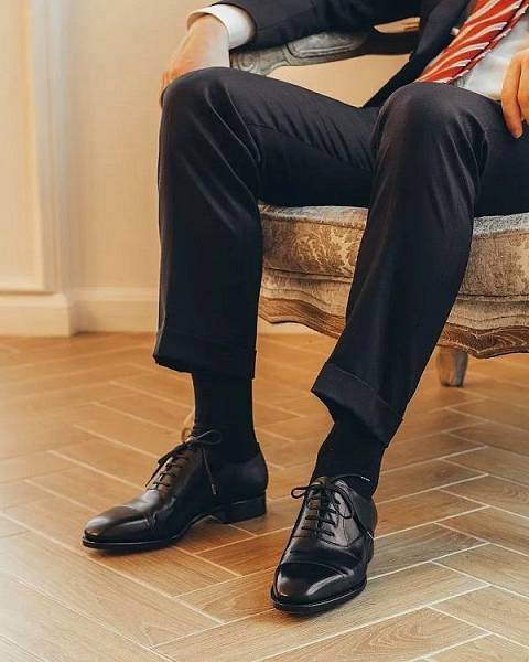 Это чрезвычайно важный нюанс. Деловые носки должны быть достаточно длинными для того, чтобы полностью закрывать те части ваших ног, что приоткрываются, когда вы садитесь. Если между брюками и носком видна полоска кожи, впечатление от вашего образа почти наверняка будет испорчено. На этот нюанс особенно стоит обратить внимание, если вы любите сидеть, положив ногу на ногу, потому что в таком случае брюки поднимаются достаточно высоко.Самый надёжный вариант – это гольфы, то есть носки до колена (knee-high socks, over-the-calf socks). Они надёжно фиксируются на ноге, не сползают и закрывают всю часть ноги, которая может показаться из-под брюк. Носки, доходящие примерно до середины икры (mid-calf socks) – компромиссный вариант. Их длина варьируется в зависимости от бренда и модели. Правило здесь одно: чем длиннее, тем лучше. Впрочем, даже достаточно длинные носки mid-calf могут сползать – и стоит иметь в виду, что одному человеку какие-то mid-calf носки могут хорошо подойти, а другому – уже нет. Это зависит от анатомии ног и от того, насколько точно носки подобраны по размеру – и тут мы плавно переходим к следующему важному аспекту.
