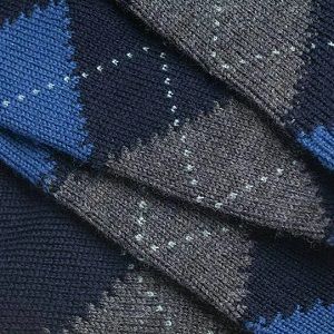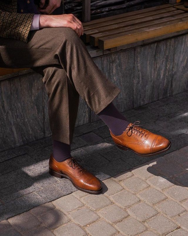На всякий случай заметим, что в случае с носками с орнаментами можно и не подбирать оттенок точно под брюки; достаточно, чтобы такие носки просто гармонировали с брюками и контрастировали с ними, но этот контраст может быть неброским и элегантным. Другими словами, к серым брюкам могут подойти, например, серые носки в синюю полоску – но подойдут и синие носки в серую полоску, просто стоит иметь в виду, что они дадут другой визуальный эффект. Можно, разумеется, рассмотреть и варианты с другими узорами и цветовыми комбинациями – например, в «ёлочку» двух оттенков серого цвета или «собачий клык» двух оттенков синего цвета (но на всякий случай стоит заметить, что носки в «ёлочку» или «собачий клык» не рекомендуется надевать с брюками с тем же узором).