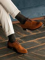 Добавим, что носки с неброским классическим узором нередко оказываются более универсальными, чем однотонные. Дело в том, что однотонные носки чаще всего пытаются подобрать либо к обуви, либо к брюкам – но, например, найти серые носки, в точности соответствующие по оттенку каким-то серым брюкам, вовсе не так уж просто, как может показаться на первый взгляд – и уже хотя бы по этой причине модели с узорами не стоит сбрасывать со счетов (а вот что стоит сбросить со счетов, так это однотонные носки, близкие по оттенку к брюкам, но всё же отчётливо другие – соответствующие сочетания выглядят посредственно). Да, всегда можно найти однотонные носки, удачно контрастирующие и с брюками, и с туфлями, но, как очевидно по тексту выше, не всем они идеально подходят (эффекта «удлинения ног» в данном случае ждать точно не стоит) – а кроме того, они могут привлечь чрезмерное внимание к вашим лодыжкам, но при этом далеко не всегда произвести сильное и положительное впечатление из-за простоты дизайна.