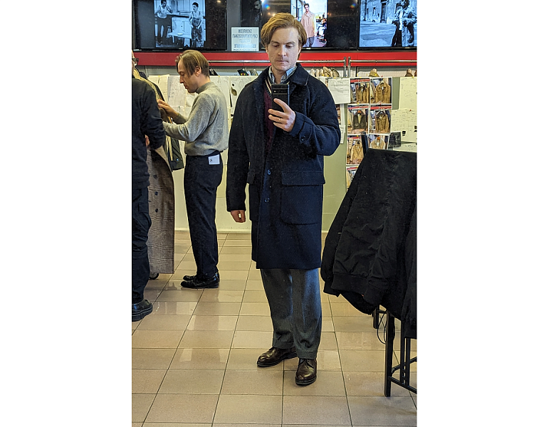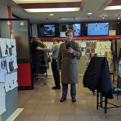 После осмотра мы вернулись в точку откуда начали – в офис обсуждения коллекций. Сразу же мне предложили примерить несколько пальто из осенне-зимней коллекции и поделиться ощущениями. Понравилось двубортное пальто из шерсти в клетку принца Уэльского – главный претендент для заказа на будущий сезон.