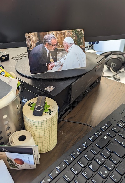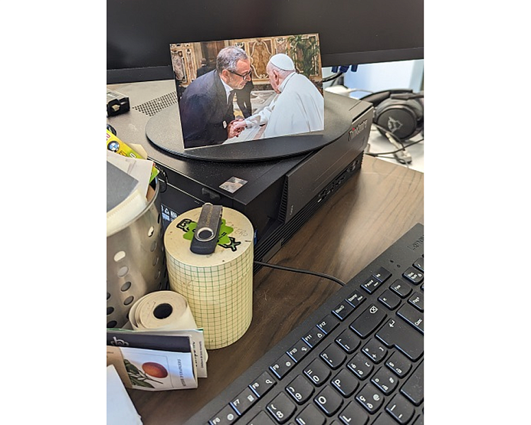 Когда двери офиса открылись, вышли главный дизайнер бренда и два брата: Марко и Симоне Ланди. После добродушного приветствия мы начали экскурсию по фабрике. Проходя мимо офисных помещений, Марко показал мне своё рабочее место, где я приметил интересную фотографию. На ней запечатлена его встреча с Папой Римским Франциском. Так как Марко является ещё и президентом ассоциации мелких и ремесленных предприятий, он курирует представителей среднего бизнеса и производств, отстаивающих важность знака качества Made in Italy, которые ежегодно встречаются в Риме.