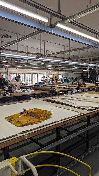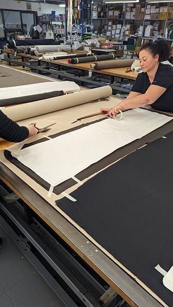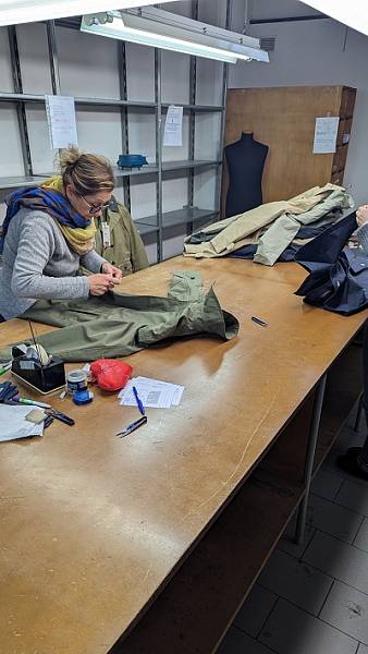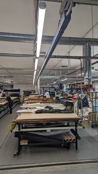 Спустившись вниз, мы попали в цех, где кипит рабочий процесс. Ткани раскладываются на больших столах и кроятся при помощи станков под чутким руководством сотрудников. Здесь я увидел, как вырезаются детали из фирменной клетчатой ткани для подкладки плащей L'impermeabile, а также из габардина – основного материала для лицевой части одежды.