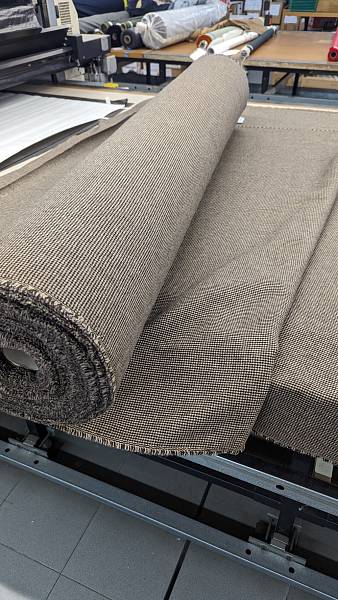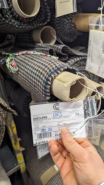 Среди множества рулонов я наткнулся на знакомую шерстяную ткань в ломаную клетку (англ. houndstooth) – из неё мы каждый сезон заказываем двухсторонние плащи. Такая шерсть используется как для подкладки плащей, так и в качестве основной лицевой ткани для пальто Балмакаан.