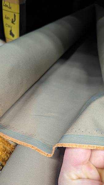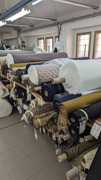 Еще ниже по лестнице – и мы попали в склад тканей, где глаза стали разбегаться от изобилия разноцветных рулонов. Марко обратил внимание на ткань из 100% хлопка под названием New Bright. Зеленоватый вариант этой ткани необычно переливается на свету. Секрет оказался прост – в полотно также вплетены нити оранжевого цвета, и именно они дают подобный эффект.