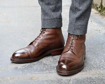 Добавим, что стоит избегать слишком строгих моделей обуви из зернистой кожи. Так, оксфорды cap toe (с отрезным мыском) и без брогирования, сшитые из зернистой кожи, выглядят странновато и обладают малым потенциалом сочетаемости. Другое дело – дерби с обычными или норвежскими (раздвоенными) мысами, с брогированием или без него. Удачным выбором могут стать и ботинки с открытой шнуровкой. Наиболее универсальным цветом будет коричневый – от светлого рыжеватого до очень тёмного или же с бордовым оттенком.