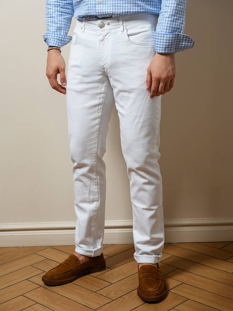 В нашем магазине представлены модели Michelangelo (слегка зауженный крой, в нескольких цветовых вариантах, плотность денима - 11 oz.) и Leonardo (зауженный крой, пуговицы-болты на застежке, плотность денима - 11 oz.), а также хлопковые брюки-чинос Luis с фирменными буквенными вставками.
