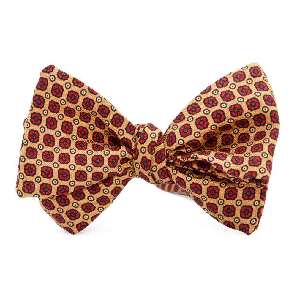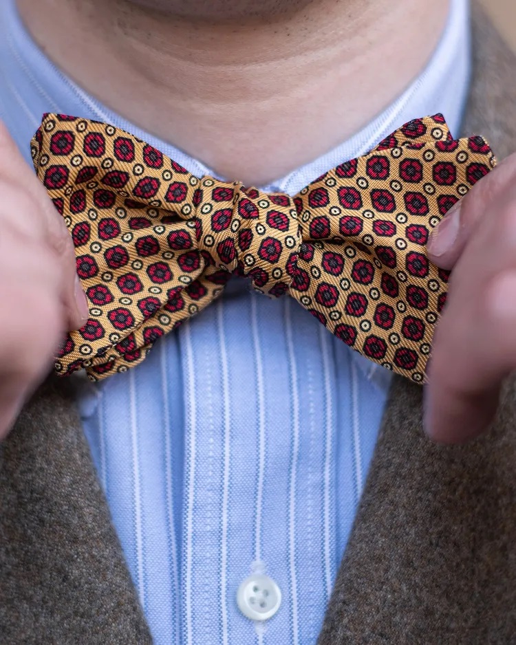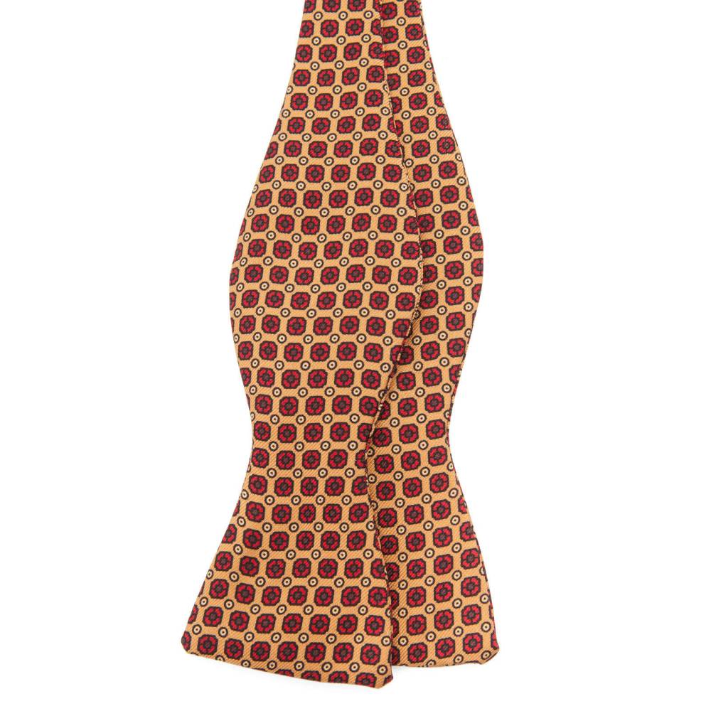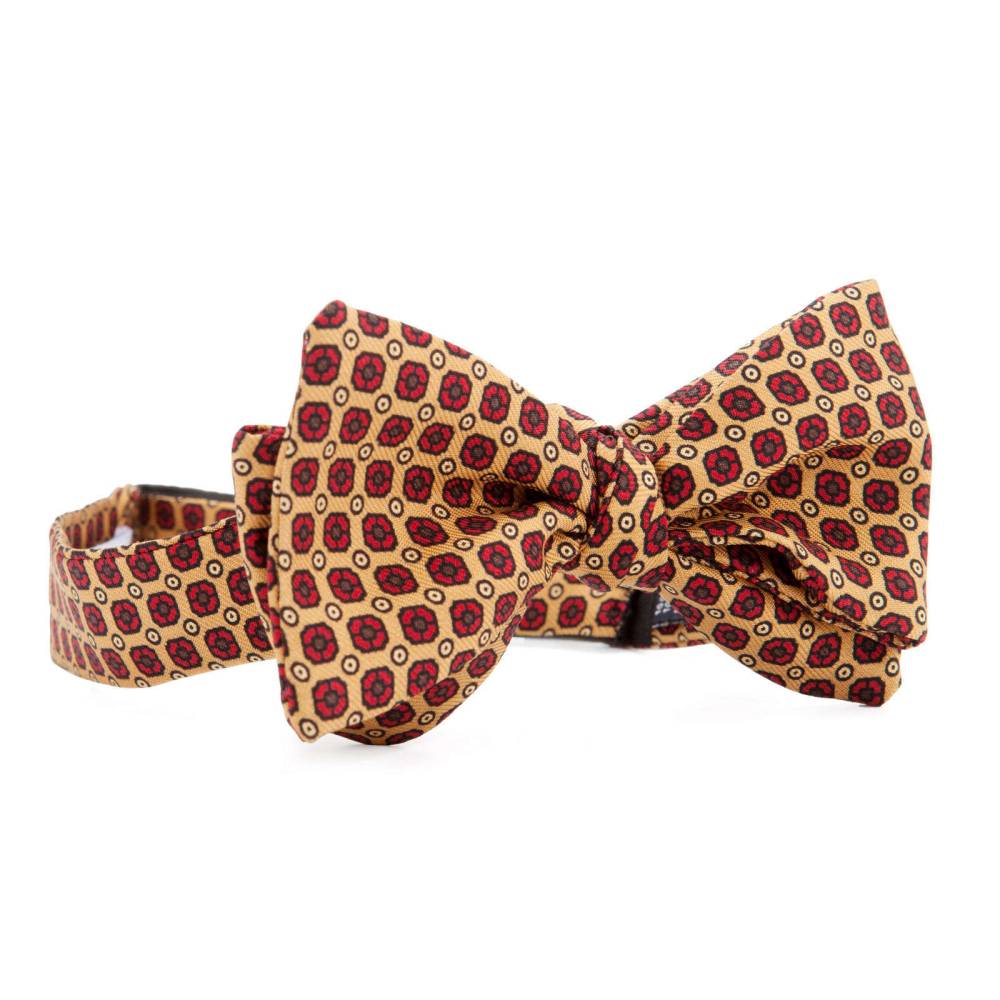 Яркая мужская бабочка из высококачественной шёлковой ткани жёлтого цвета с контрастным узором. Размер регулируется при помощи пластиковой застёжки. Бабочка сделана вручную на небольшой итальянской фабрике семейного бренда Petronius в Милане. Больше 80 лет в этом ателье занимаются пошивом роскошных аксессуаров из отборных натуральных тканей. Продукция Petronius представлена в старейших бутиках и универмагах мира, среди которых Barney's и Bergdorf Goodman в Нью-Йорке.