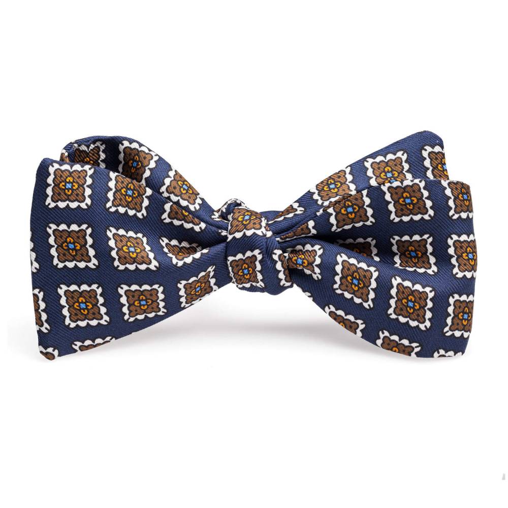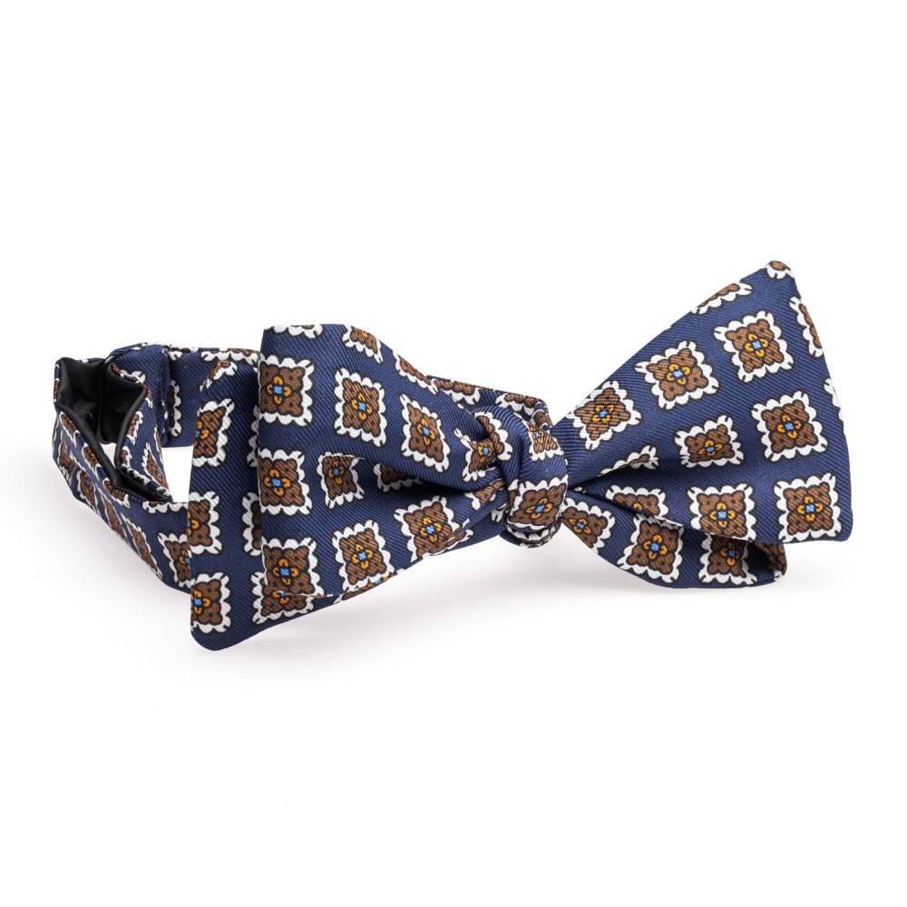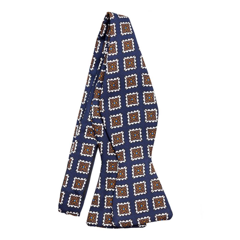 Классическая бабочка из высококачественного шелка тёмно-синего цвета. Полотно ткани украшено квадратными узорами белых, синих и жёлтых оттенков. Размер регулируется при помощи пластиковой застёжки. Бабочка сделана вручную на небольшой итальянской фабрике семейного бренда Petronius в Милане. Больше 80 лет в этом ателье занимаются пошивом роскошных аксессуаров из отборных натуральных тканей. Продукция Petronius представлена в старейших бутиках и универмагах мира, среди которых Barney's и Bergdorf Goodman в Нью-Йорке.
