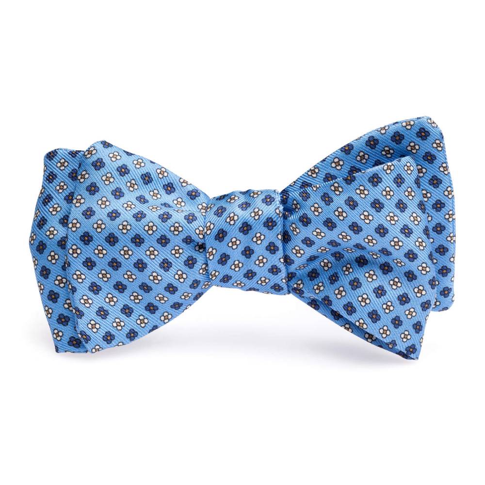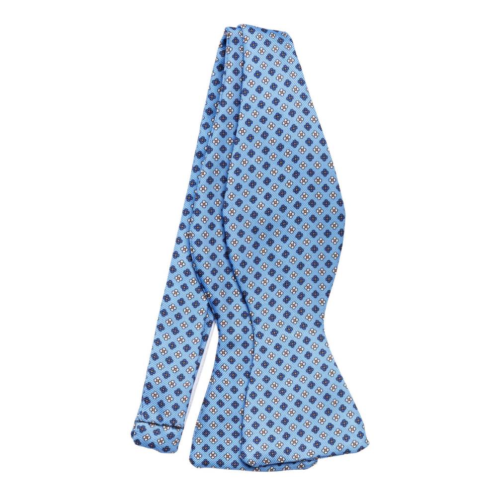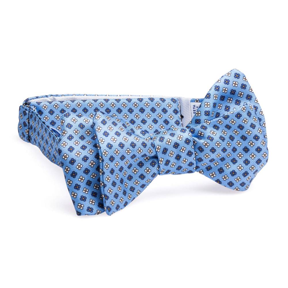 Классическая бабочка из высококачественного шелка синего цвета. Полотно ткани украшено цветочными узорами белых, синих и жёлтых оттенков. Размер регулируется при помощи пластиковой застёжки. Бабочка сделана вручную на небольшой итальянской фабрике семейного бренда Petronius в Милане. Больше 80 лет в этом ателье занимаются пошивом роскошных аксессуаров из отборных натуральных тканей. Продукция Petronius представлена в старейших бутиках и универмагах мира, среди которых Barney's и Bergdorf Goodman в Нью-Йорке.