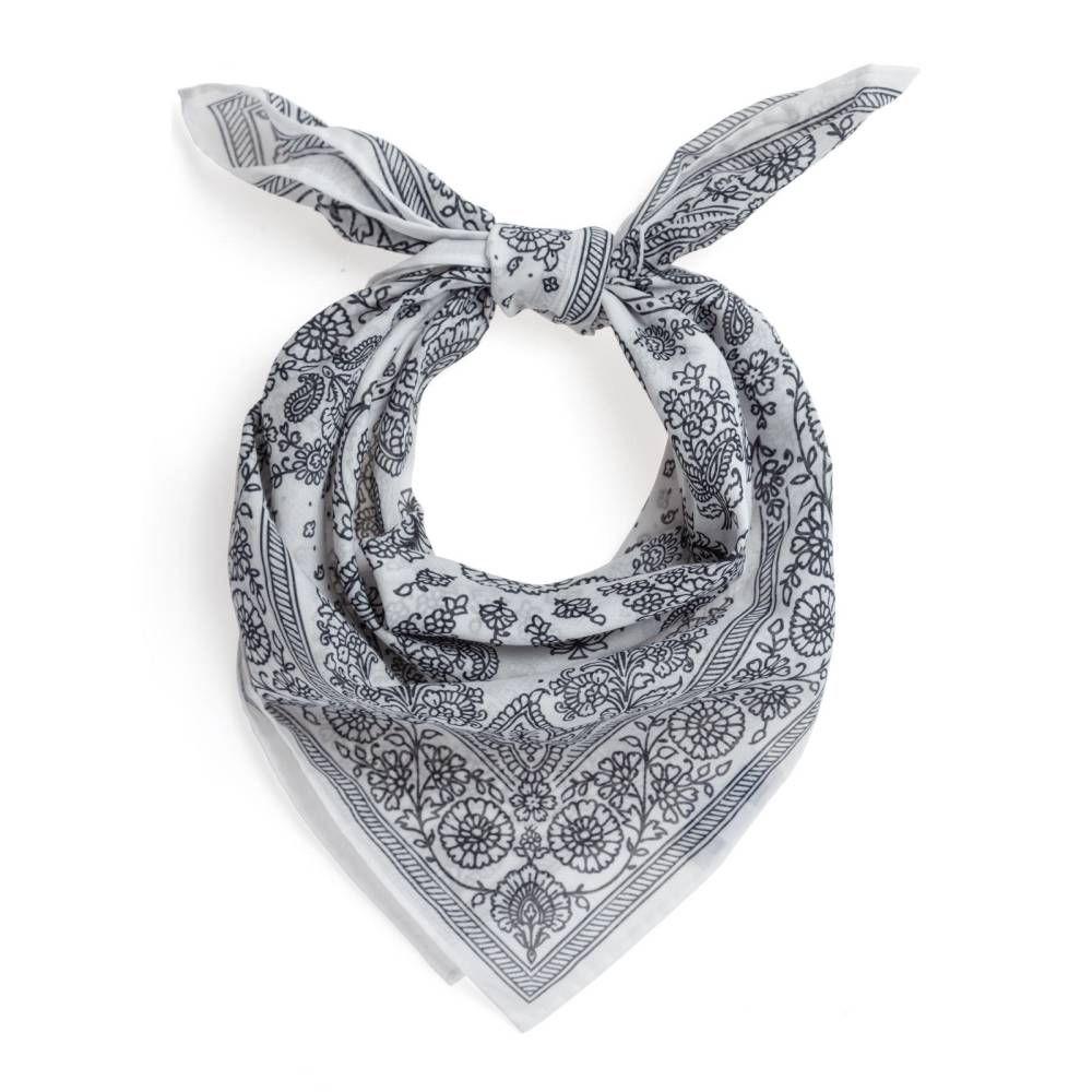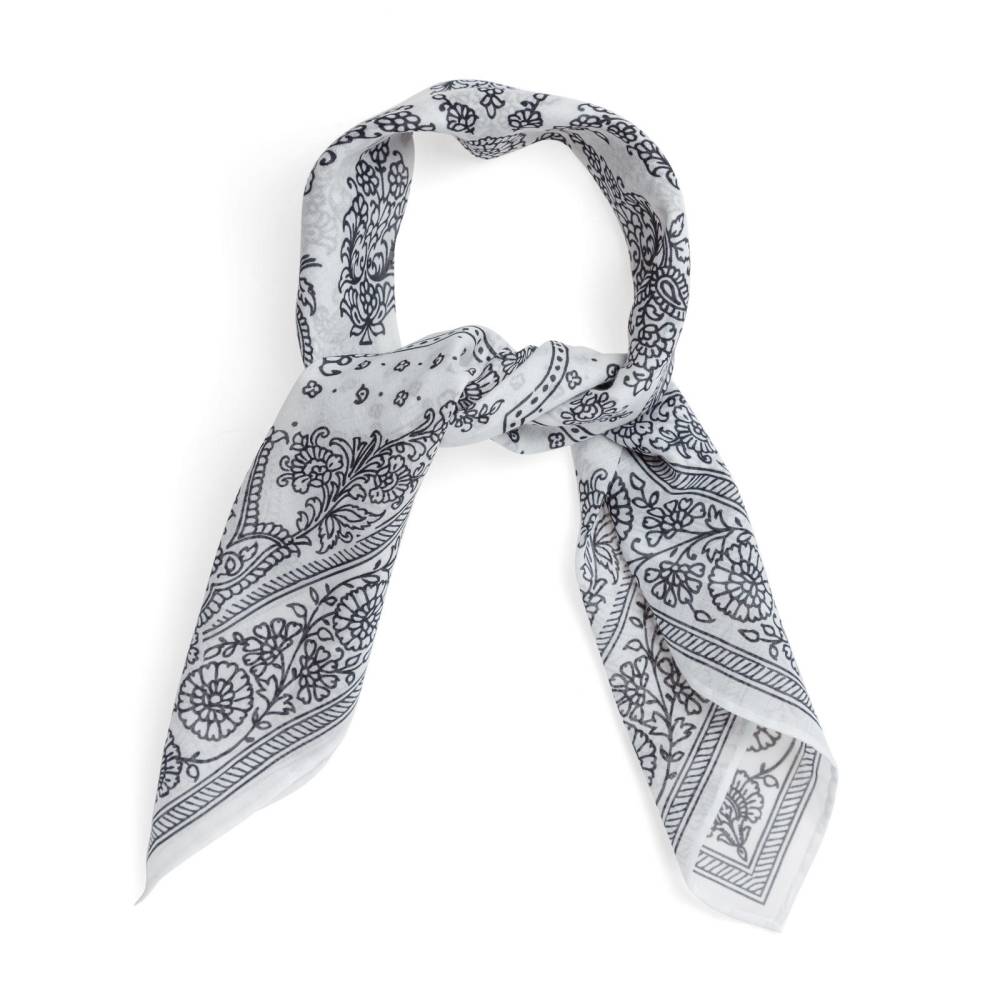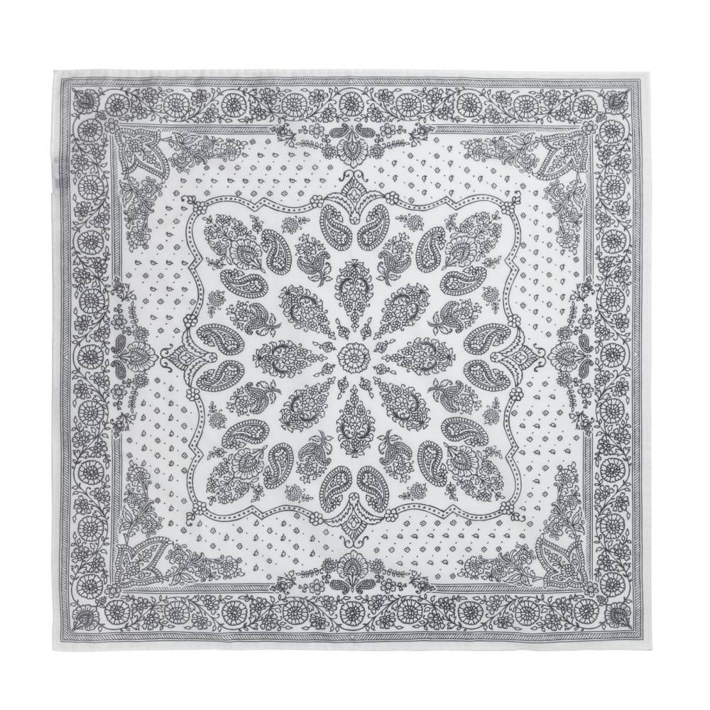Стильная бандана Arcuri из тонкой, приятной на ощупь хлопковой ткани. Аксессуар белого цвета с традиционными контрастными витиеватыми узорами пейсли. По всему периметру края подшиты вручную. Размер банданы позволяет удобно повязывать её всевозможными узлами на шее или же носить в заднем кармане джинсов. Элегантный аксессуар, который становится все более популярным в классическом гардеробе, добавляя изысканный акцент образу.