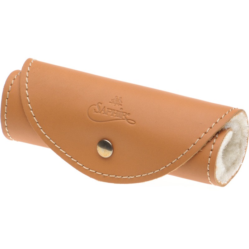 Бархотка Saphir незаменимый аксессуар в наборе по уходу за обувью. Она предназначена для финишной обработки поверхности кожи. После того как крем впитался в кожу и появился глянец, при помощи бархотки необходимый участок обуви полируется до зеркального блеска. С внешней стороны бархотка выполнена из матовой кожи бежевого оттенка, а с внутренней из натуральной шерсти. Модель компактно скручивается и застегивается на металлическую кнопку.