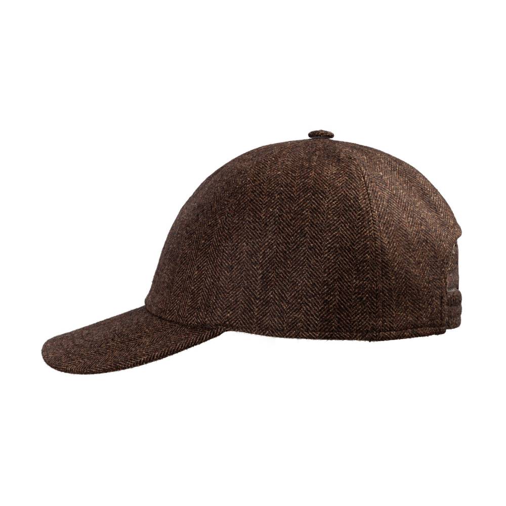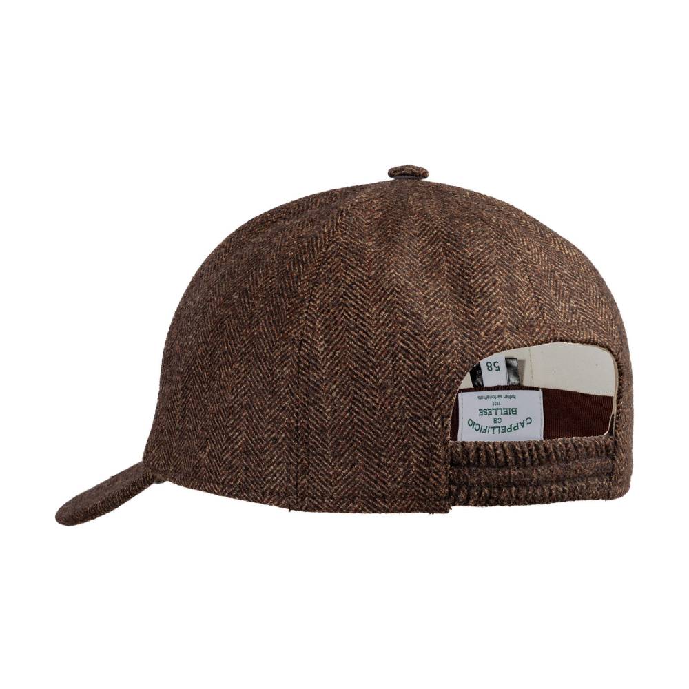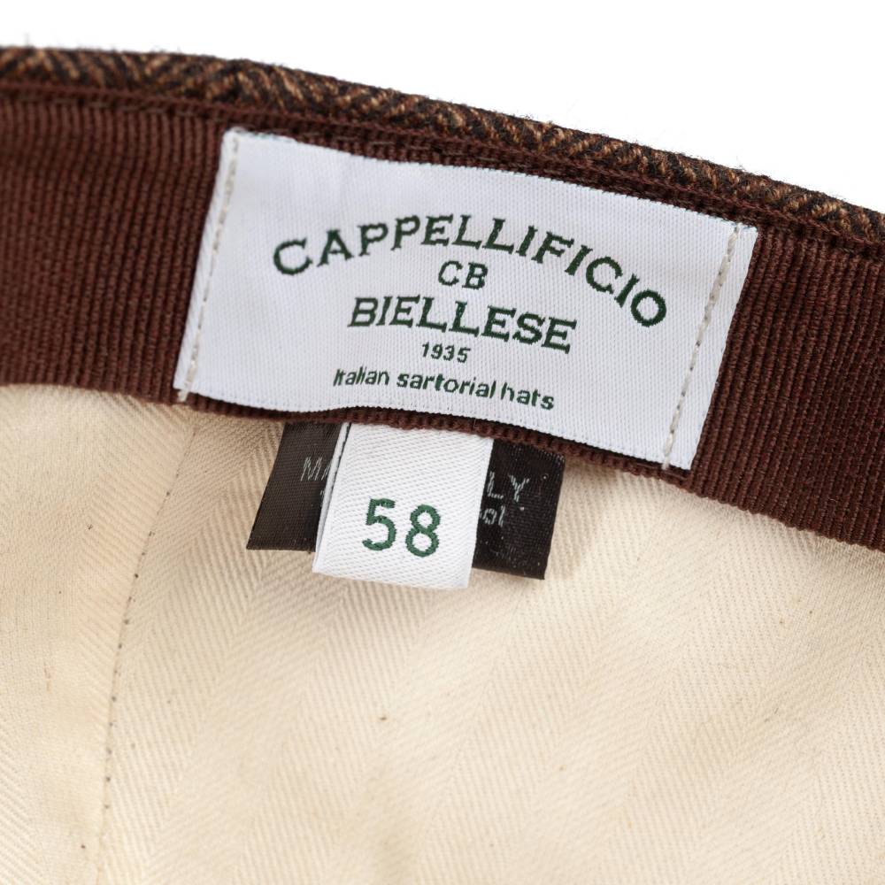 Бейсболка ручной работы Cappellificio Biellese выполнена из приятной на ощупь шерстяной ткани Fratelli Tallia di Delfino в ёлочку. Подкладка из фактурного хлопка фирмы Azienda Foderami Dragoni. Так как модель создана мастерами ателье, она адаптирована под классический стиль. Задний ремешок вшит и является эластичным. Этот факт играет важную роль при подборе, так как необходимый размер будет комфортнее ощущаться на голове.