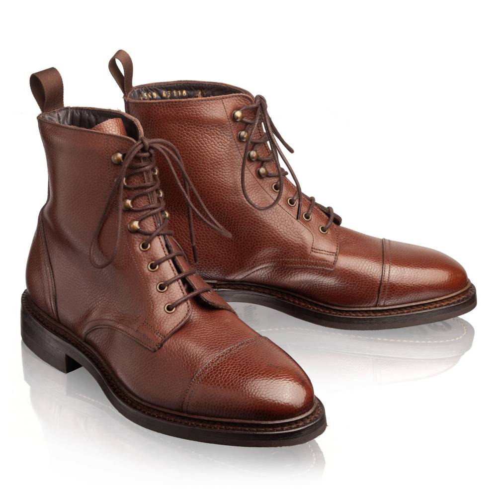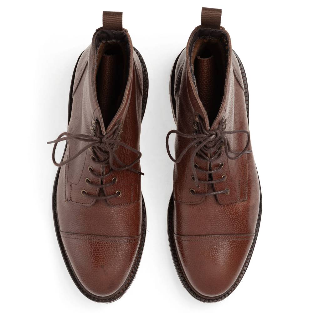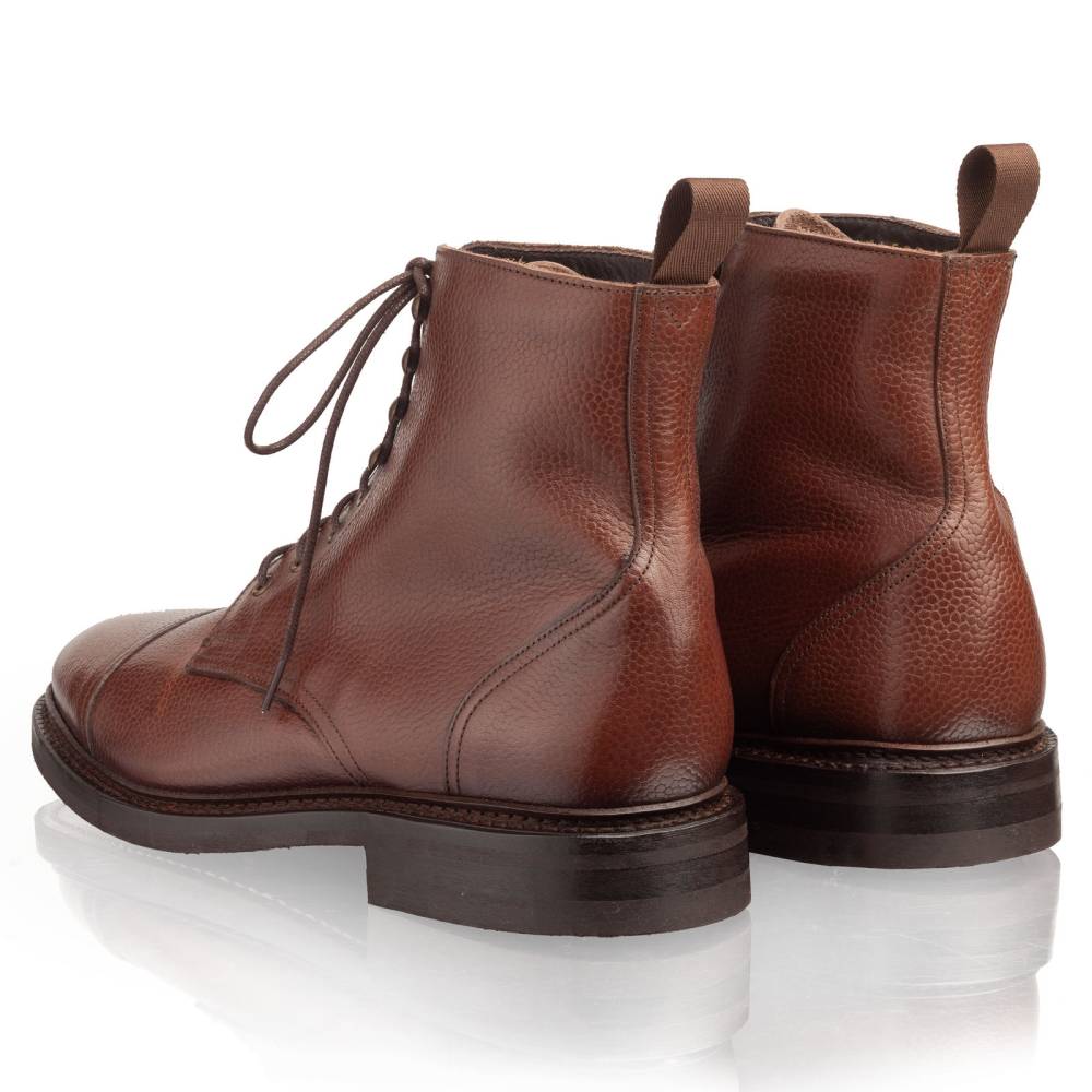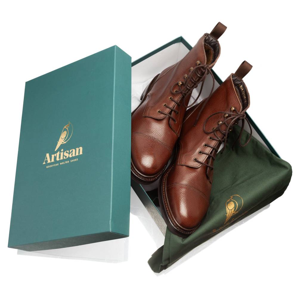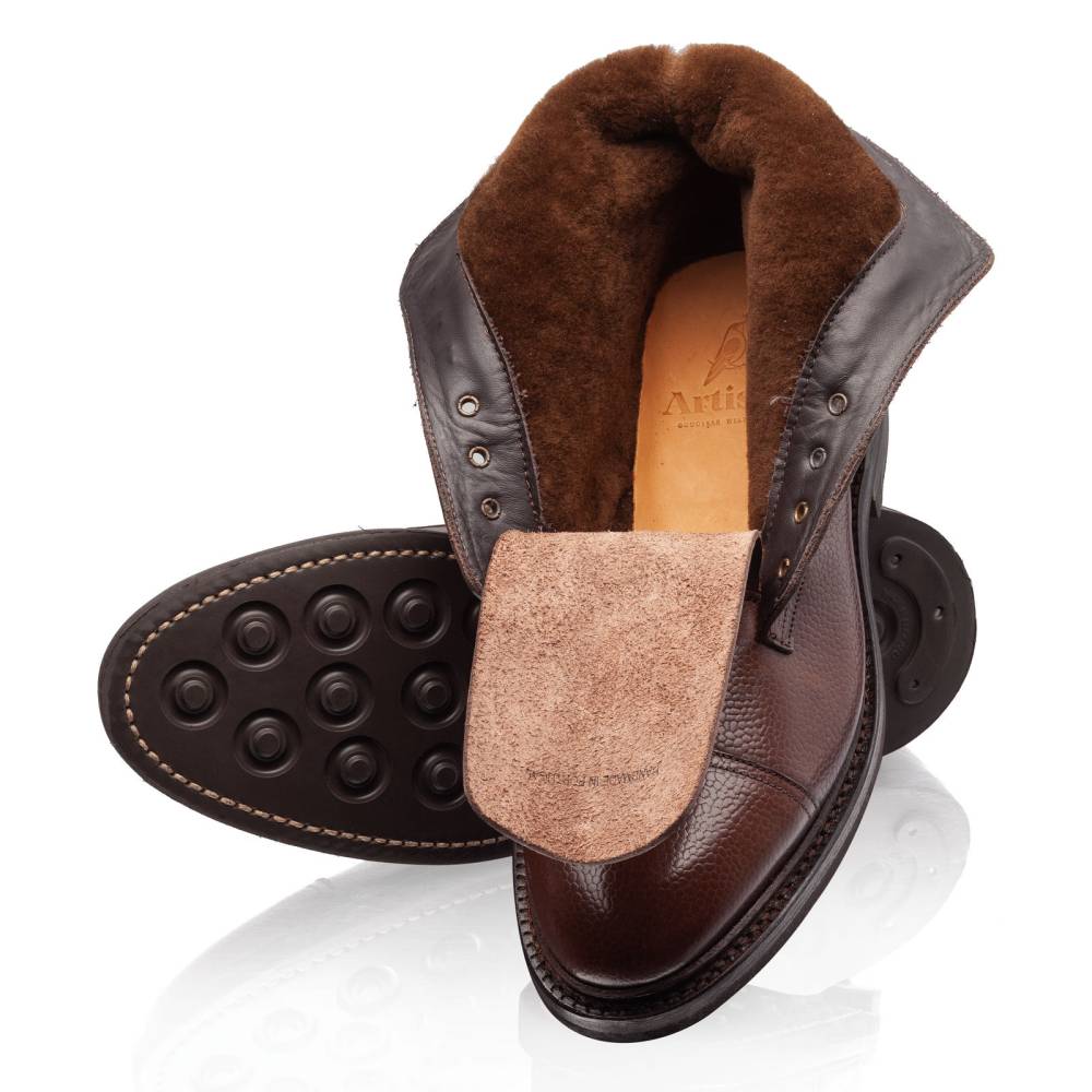 Тёплые высокие ботинки Artisan Bergen изготовлены в Португалии в конструкции Goodyear Welted. Модель является адаптированной версией военных десантных прыжковых ботинок (англ. Jumper boots). Характерными чертами таких ботинок являются высокая шнуровка с люверсами, резиновая подошва с протектором и отрезной мысок. В исполнении Artisan модель выполнена из плотной коричневой телячьей кожи с зернистой фактурой, имеет прочную резиновую подошву Dainite с промежуточным кожаным слоем и штормовой рант. Внутри, за исключением стельки, пара утеплена густым, но коротким натуральным мехом, который не стесняет движения.