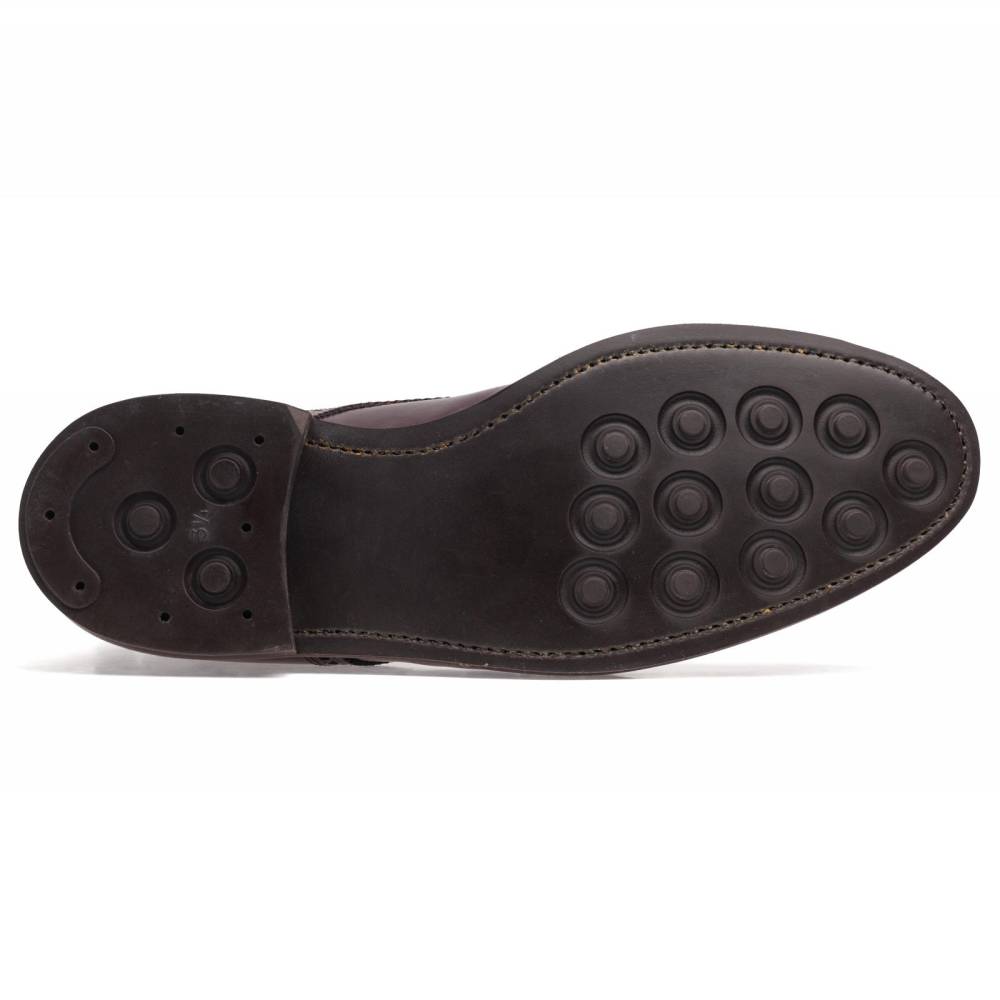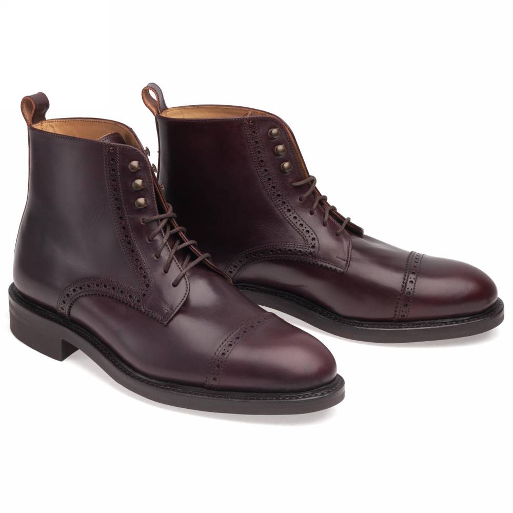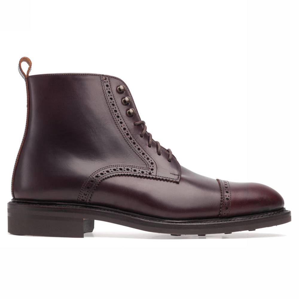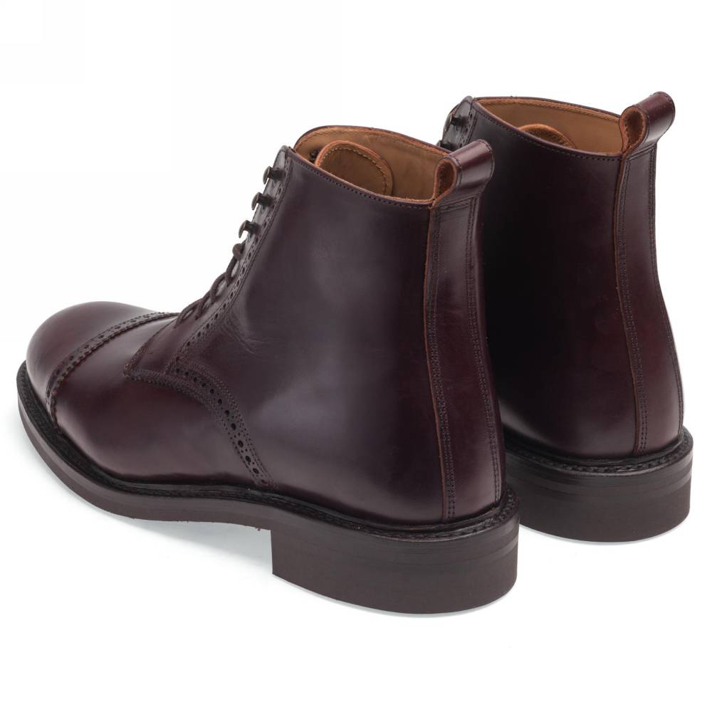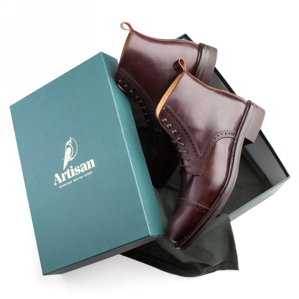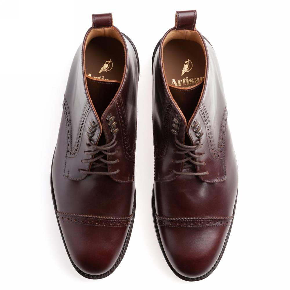 Высокие ботинки Artisan Boston для повседневного осеннего и зимнего гардероба. Верх выполнен из жированной тёмно-коричневыой телячьей кожи, украшенной традиционными перфорированными узорами. Такая обработка кожи дополнительно защищает от влаги и осадков. Внутри цельная стелька из тонкой мягкой кожи. Модель имеет прочную подошву из резины и штормовой рант, прошитый по всей окружности. Конструкция Goodyear Welted.