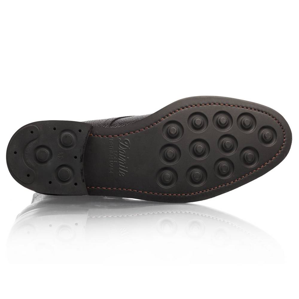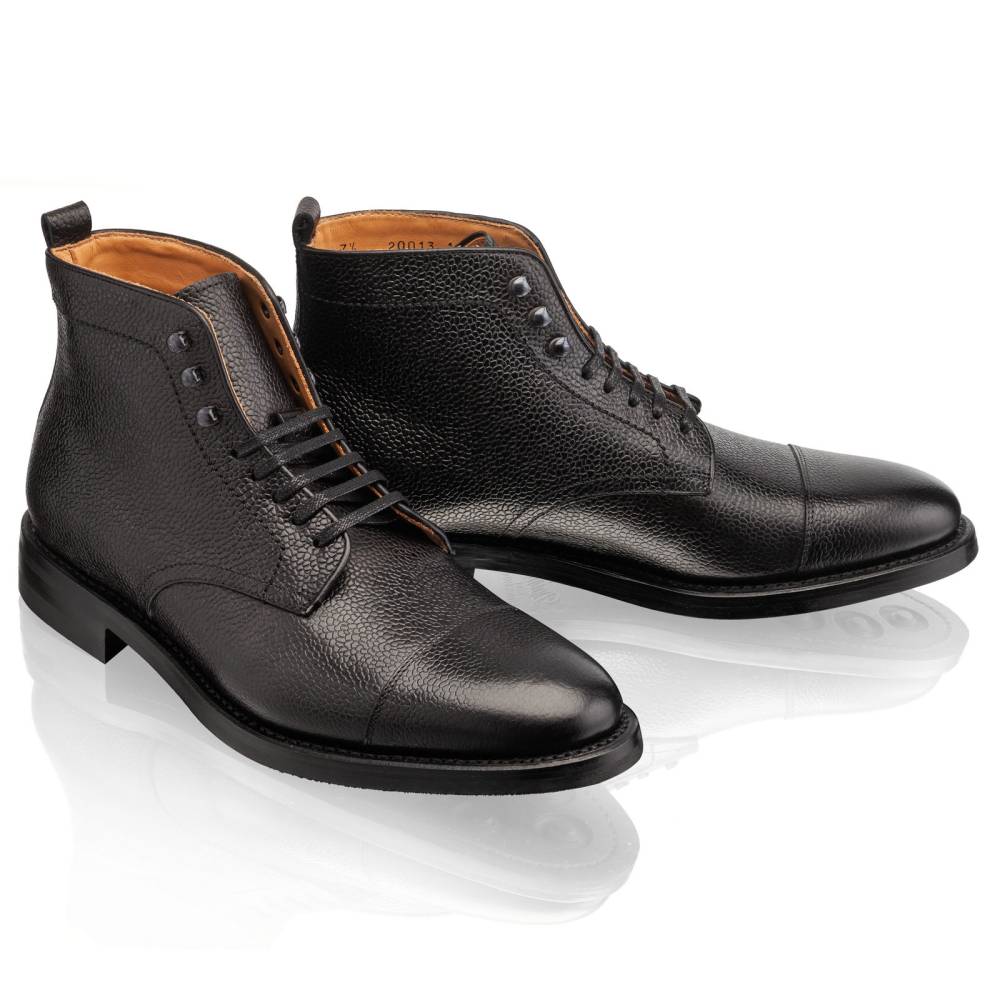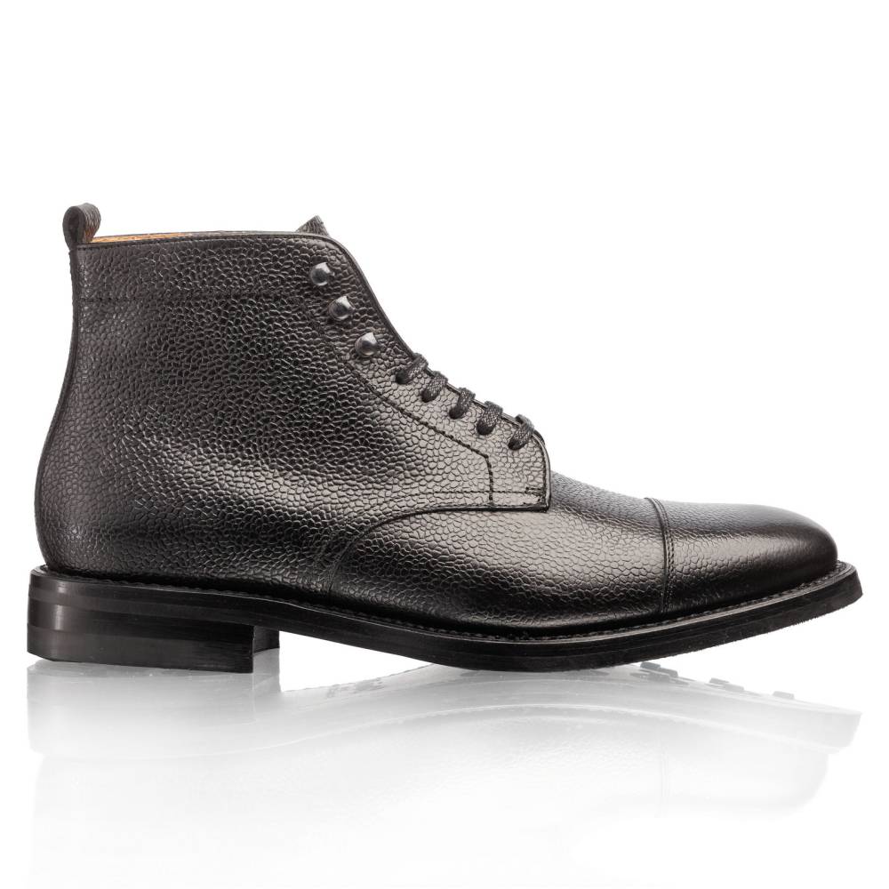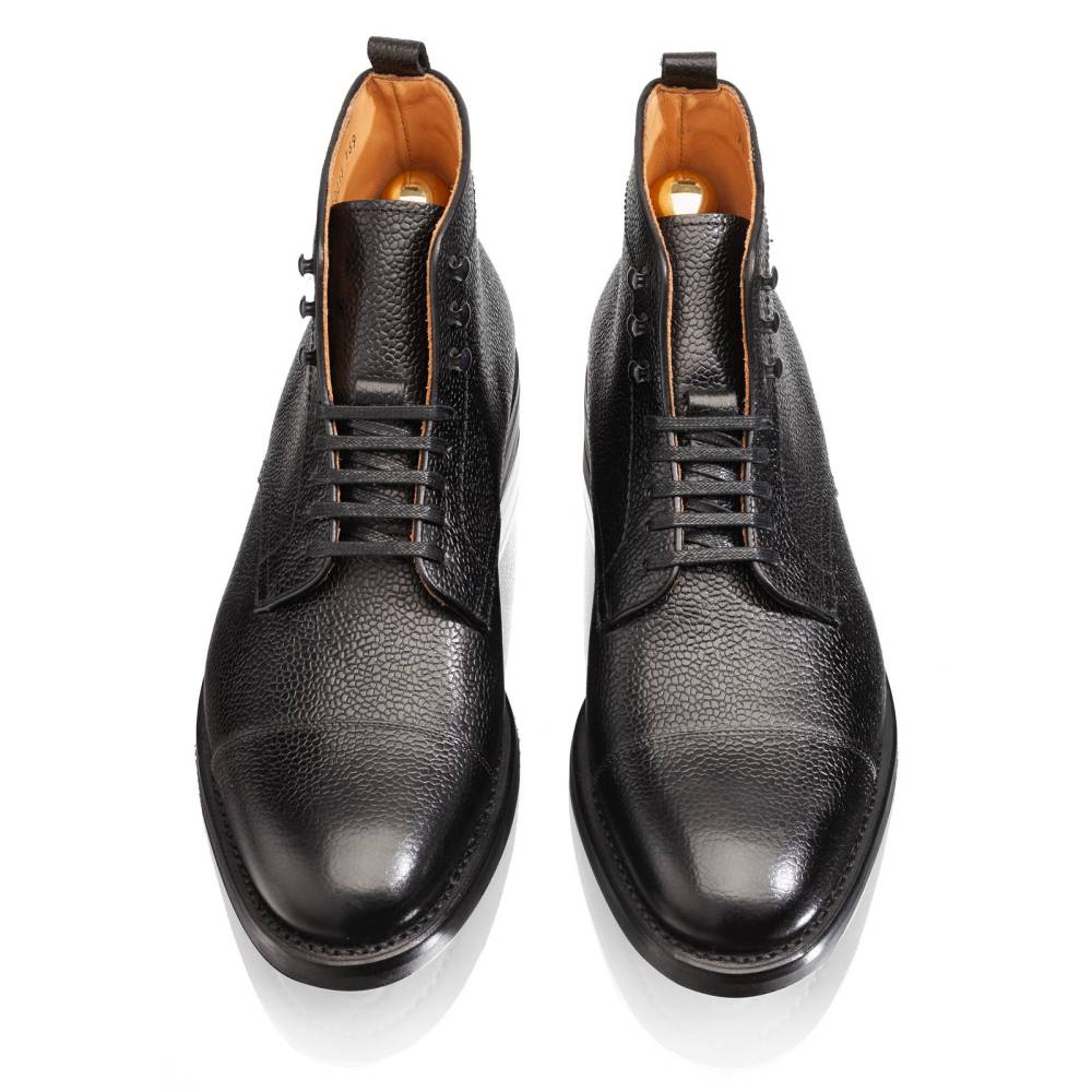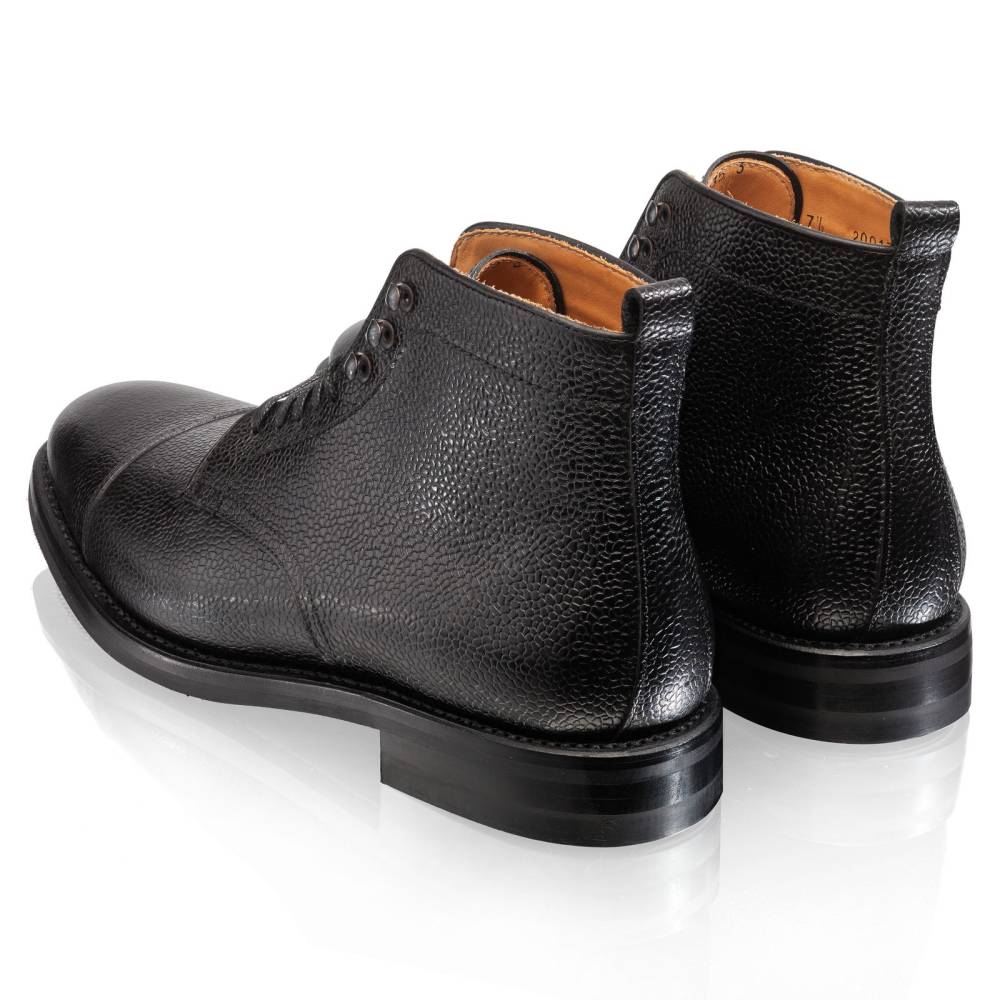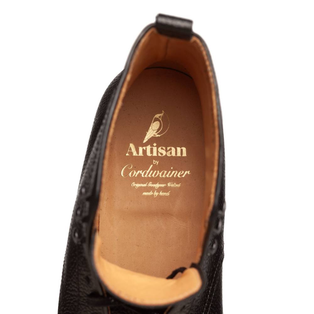 Классические мужские ботинки Jumper бренда Artisan для осенне-зимнего сезона. Верхняя часть выполнена из зернистой телячьей кожи чёрного цвета. Модель изготовлена по специальному заказу на испанской фабрике Cordwainer в городе Альманса – центре обувной промышленности Испании. Внутренняя отделка из тонкой кожи. Снизу установлена прочная резиновая подошва британской компании Dainite с промежуточным кожаным слоем. В верхней части шнурки завязываются крест-накрест при помощи металлических крючков. Конструкция Goodyear Welted.
