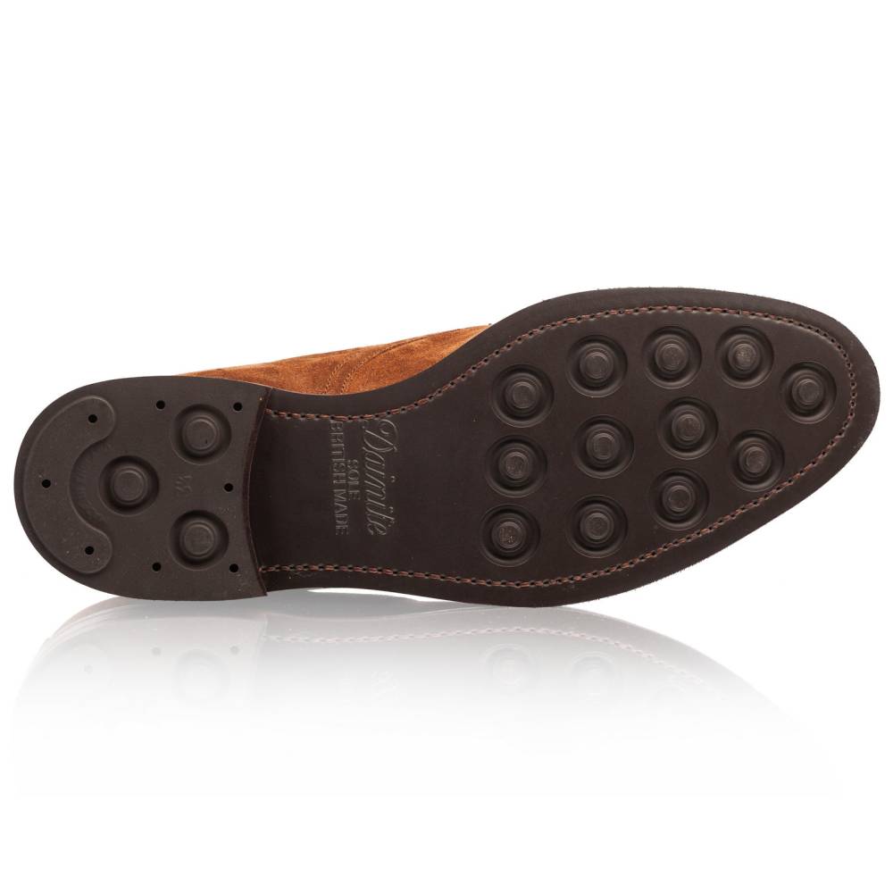 Тёплые мужские высокие ботинки Jumper бренда Artisan для холодной зимней погоды. Верхняя часть выполнена из мягкой приятной на ощупь замши коричневого цвета. Модель изготовлена по специальному заказу на испанской фабрике Cordwainer в городе Альманса – центре обувной промышленности Испании. Внутри ботинки отделаны густым натуральным мехом белого цвета, включая стельку. На нижнюю часть подошвы установлена надежная резина британской фирмы Dainite. Шнурки продеваются через металлические люверсы и затягиваются при помощи крючков в области голенища. Конструкция Goodyear Welted.
