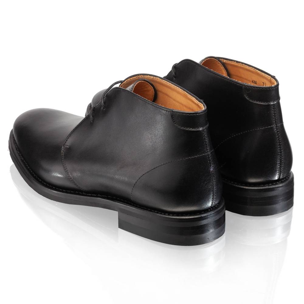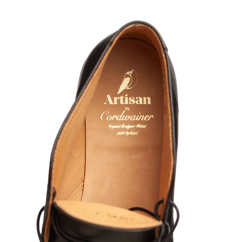 Классические мужские невысокие ботинки Montreal бренда Artisan для осенне-зимнего сезона. Верхняя часть выполнена из гладкой телячьей кожи чёрного цвета. Модель изготовлена по специальному заказу на испанской фабрике Cordwainer в городе Альманса – центре обувной промышленности Испании. Внутренняя отделка из тонкой кожи. Снизу установлена прочная резиновая подошва британской компании Dainite с промежуточным кожаным слоем. Модель имеет два отверстия для шнурков. Конструкция Goodyear Welted.