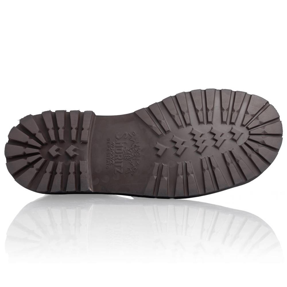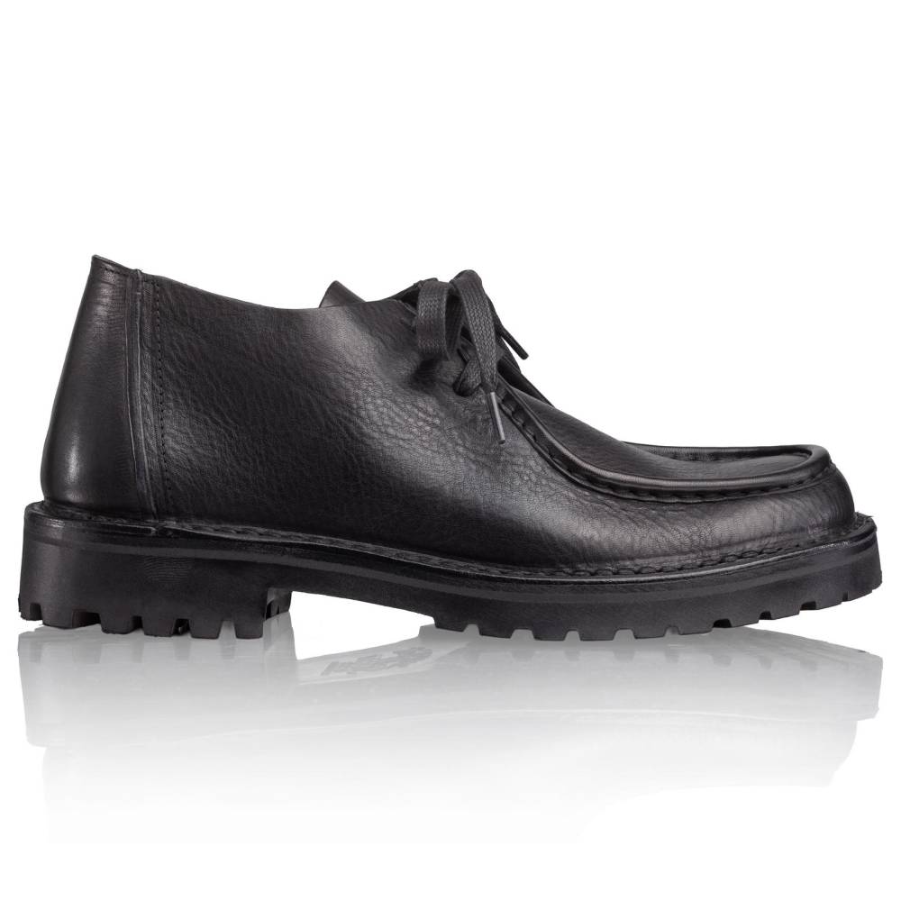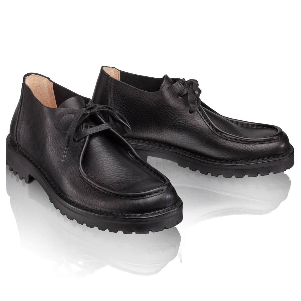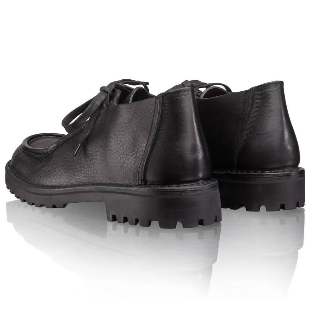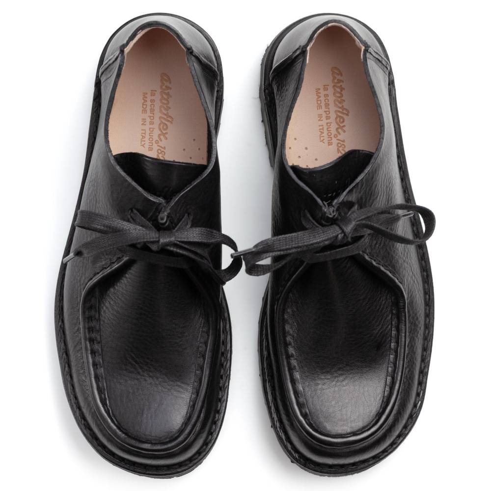 Удобные мужские ботинки итальянского бренда Astorflex, популярном тирольском стиле (Tyrolean). Характерный дизайн с прошитой вокруг носка строчкой и двумя отверстиями для шнурков. Верх из высококачественной зернистой телячьей кожи черного цвета. Модель выполнена без подкладки, что обеспечивает отличную воздухопроницаемость. Внутри съёмная стелька из кожи и пены с эффектом памяти (memory foam) и прочную резиновую подошву с протектором St. Moritz. Между верхом и подошвой ботинки дополнены промежуточным слоем из плотной кожи, который делает обувь более структурированной и износостойкой. Метод сшивания stitch-down (доппельный метод крепления).