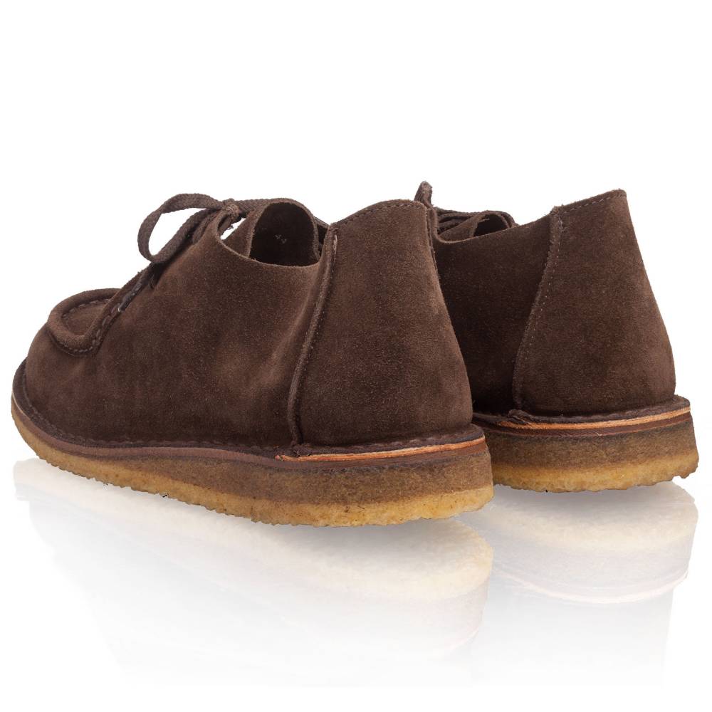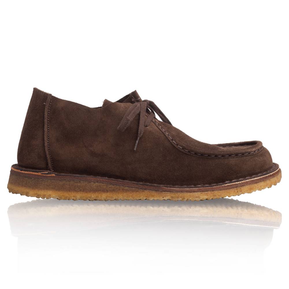 Удобные мужские ботинки итальянского бренда Astorflex, в популярном тирольском стиле (Tyrolean). Характерный дизайн с прошитой вокруг носка строчкой и двумя отверстиями шнурков. Верх из высококачественной тосканской замши тёмно-коричневого цвета, обработанной методом растительного дубления (с использованием коры дуба). Модель выполнена без подкладки, что обеспечивает отличную воздухопроницаемость. Установлены на гибкую подошву из натурального каучука. Между верхом и подошвой ботинки дополнены промежуточным слоем из плотной кожи, который делает обувь более структурированной и износостойкой. Метод сшивания stitch-down (доппельный метод крепления).