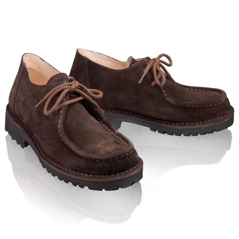 Удобные мужские ботинки итальянского бренда Astorflex, популярном тирольском стиле (Tyrolean). Характерный дизайн с прошитой вокруг носка строчкой и двумя отверстиями для шнурков. Верх выполнен из высококачественной тосканской замши тёмно-коричневого цвета. Модель выполнена без подкладки, что обеспечивает отличную воздухопроницаемость. Внутри съёмная стелька из кожи и пены с эффектом памяти (memory foam) и гибкая резиновая подошва с протектором Commando. Между верхом и подошвой промежуточный слой из плотной кожи, который делает обувь более структурированной и износостойкой. Метод сшивания stitch-down (доппельный метод крепления).