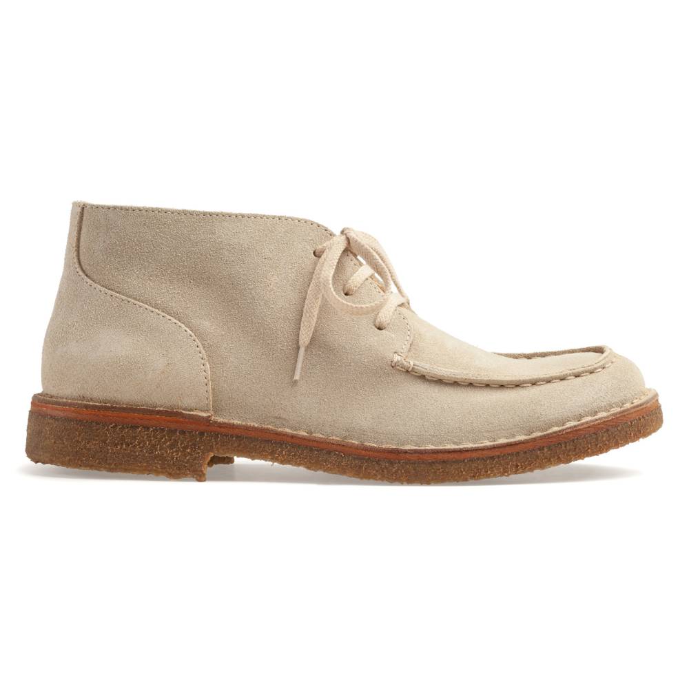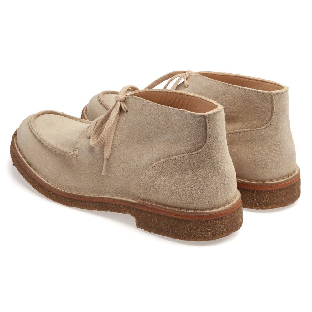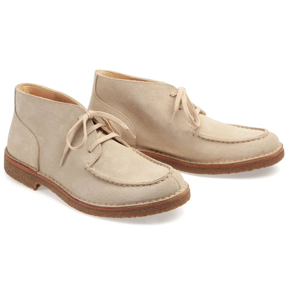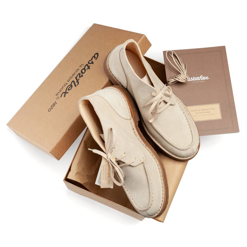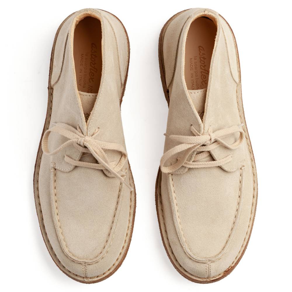 Удобные мужские ботинки чукка итальянского бренда Astorflex с оригинальным норвежским мысом (norwegian split toe). Верх выполнен из плотной замши серого цвета. Модель имеет облегчённую подкладку из кожи растительного дубления. Внутри - мягкая кожаная стелька с пористым материалом. Узнаваемой особенностью данных ботинок является гибкая и упругая подошва из натурального каучука. Обувь сшита в прочной влагостойкой конструкции stitch-down (доппельный метод крепления).