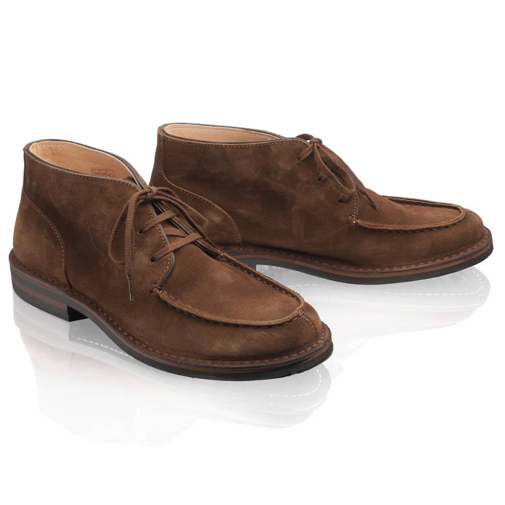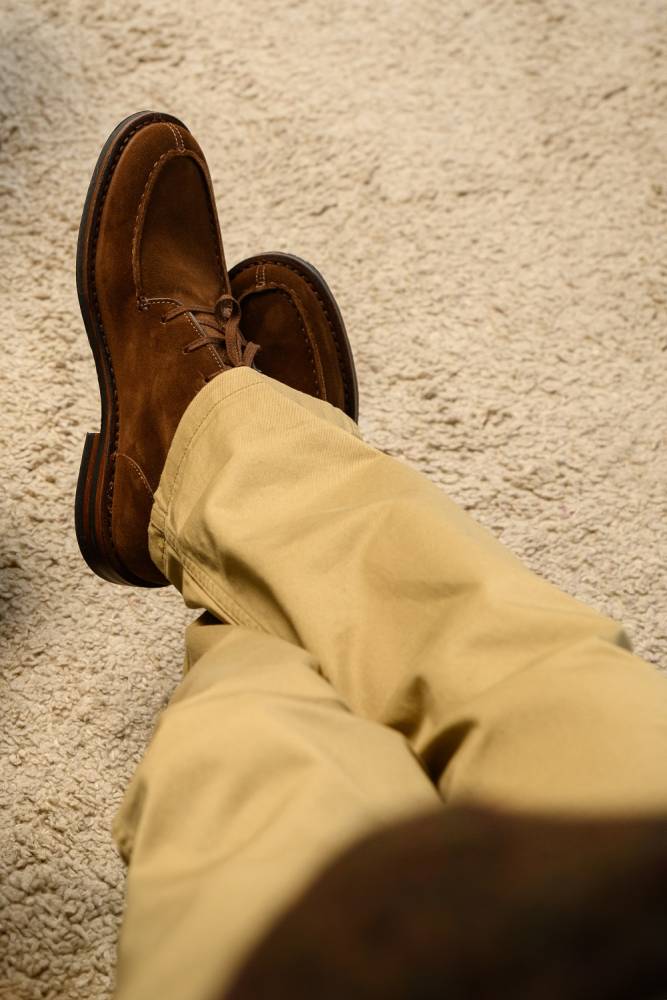 Знаменитые мужские ботинки Deukeflex итальянского бренда Astorflex c оригинальным норвежским мысом (norwegian split toe). Основное отличие от базового варианта — резиновая подошва вместо креповой. Верх выполнен из приятной на ощупь тосканской замши коричневого цвета. Внутренняя отделка из гипоаллергенной кожи растительного дубления. Модель имеет мягкую кожаную стельку с пористым материалом снизу. Практичная резиновая подошва. Пара сшита в прочной влагостойкой конструкции stitch-down (доппельный метод крепления).