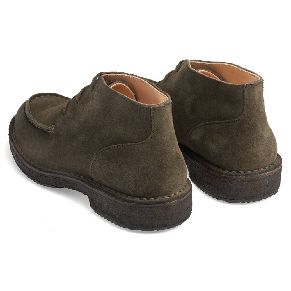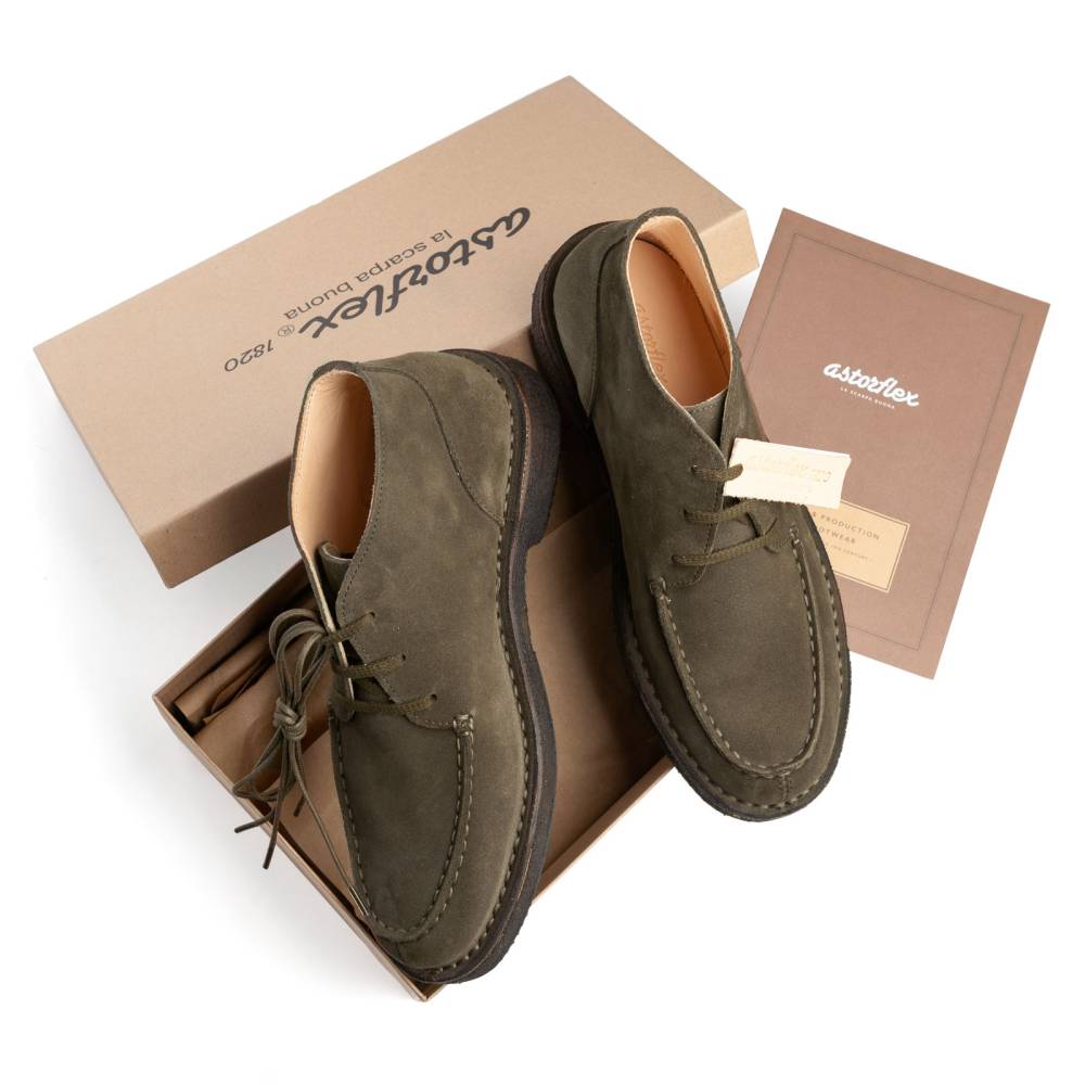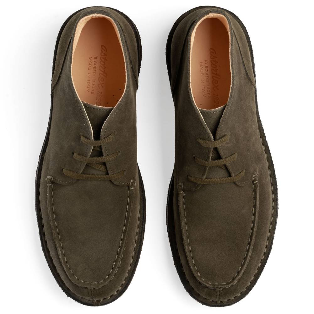 Удобные осенне-зимние мужские ботинки чукка итальянского бренда Astorflex с оригинальным норвежским мысом (norwegian split toe). Верх выполнен из плотной замши тёмно-зелёного цвета. Ботинки имеют мягкую кожаную стельку с пористым материалом снизу. Модель Markflex была специально разработана для России с учётом климата. От базовой модели (Deukeflex) она отличается более плотной кожей на подкладке, толщиной каучука на подошве, а также дополнительным резиновым слоем на каблуке и основной части подошвы. Обувь сшита в прочной влагостойкой конструкции stitch-down (доппельный метод крепления).