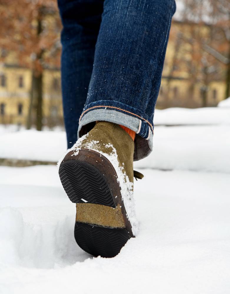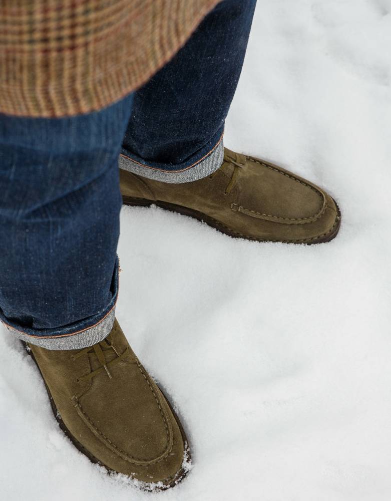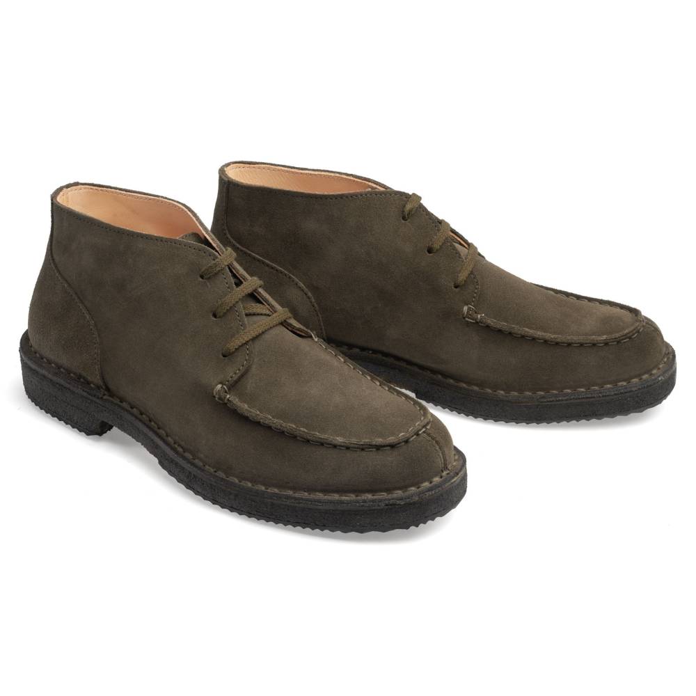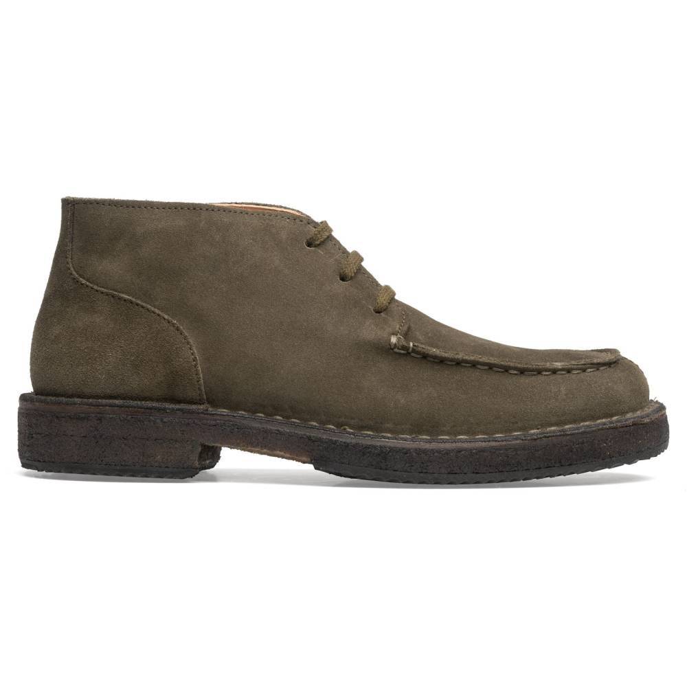 Удобные осенне-зимние мужские ботинки чукка итальянского бренда Astorflex с оригинальным норвежским мысом (norwegian split toe). Верх выполнен из плотной замши тёмно-зелёного цвета. Ботинки имеют мягкую кожаную стельку с пористым материалом снизу. Модель Markflex была специально разработана для России с учётом климата. От базовой модели (Deukeflex) она отличается более плотной кожей на подкладке, толщиной каучука на подошве, а также дополнительным резиновым слоем на каблуке и основной части подошвы. Обувь сшита в прочной влагостойкой конструкции stitch-down (доппельный метод крепления).