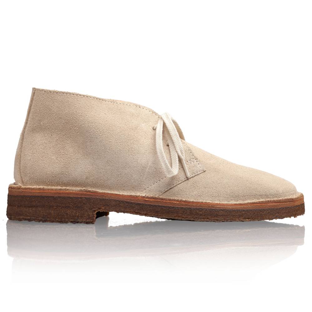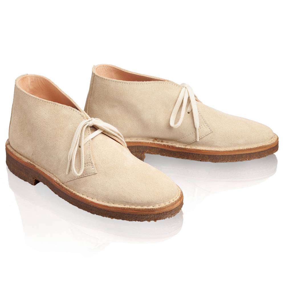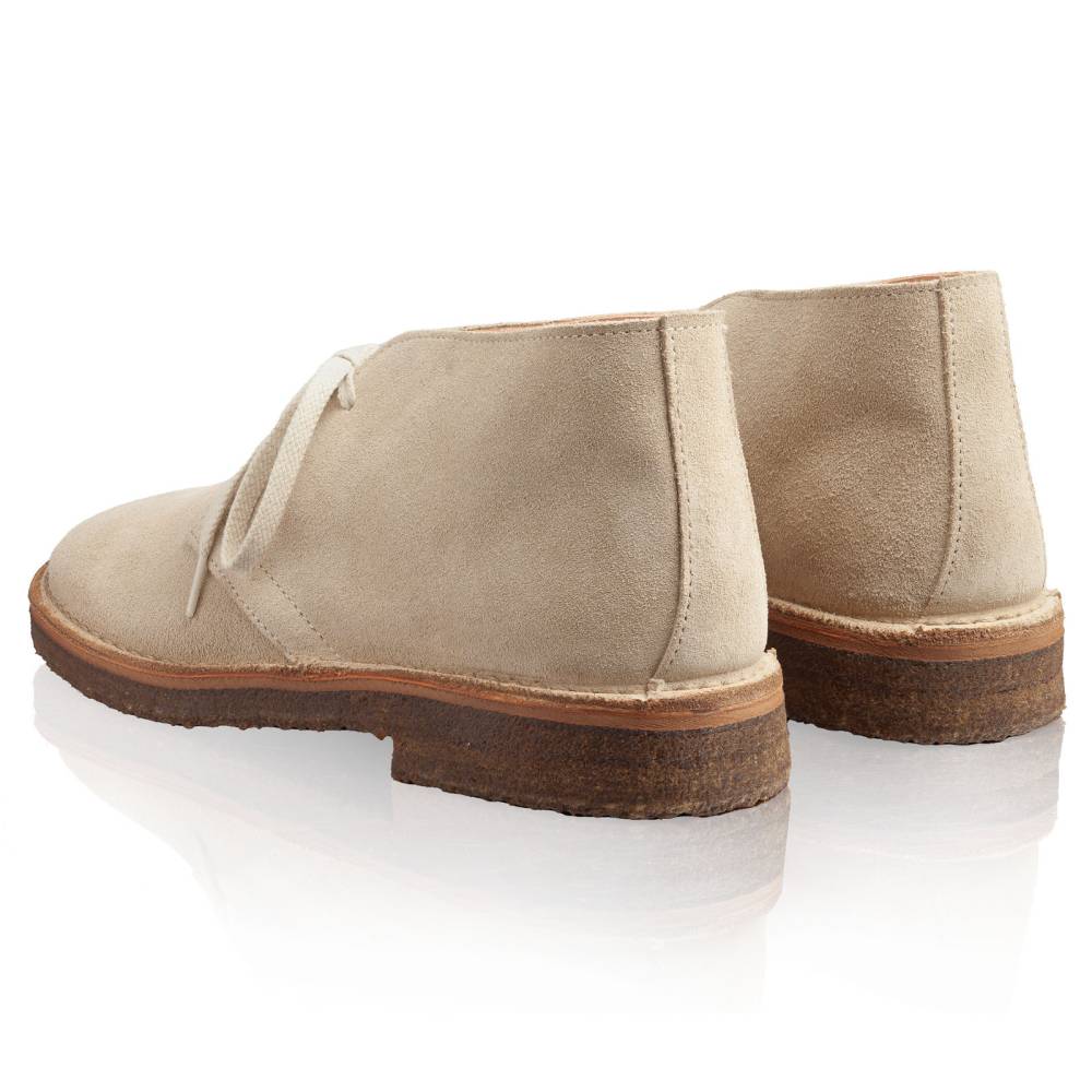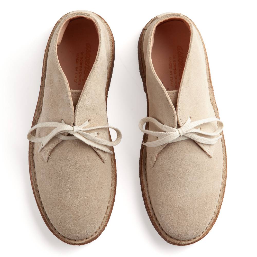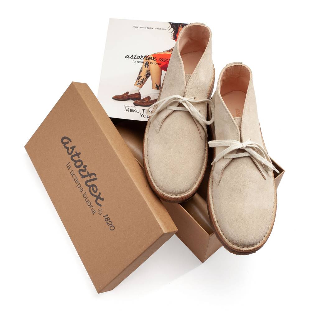 Образцовые ботинки дезерты для женщин итальянского бренда Astorflex на 100% созданные в Италии. Верх выполнен из мягкой итальянской замши светло-серого цвета. Внутренняя отделка из гипоаллергенной кожи растительного дубления. Модель имеет съёмную стельку из кожи и пены с эффектом памяти (memory foam). Узнаваемой особенностью ботинок является гибкая и упругая подошва из натурального каучука. Между подошвой и верхом для большей износостойкости установлен промежуточный слой из натуральной кожи. Обувь сшита в прочной влагостойкой конструкции stitch-down (доппельный метод крепления).