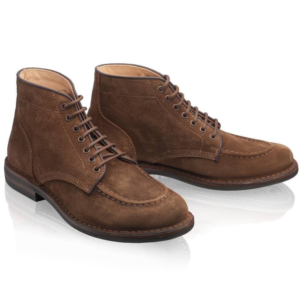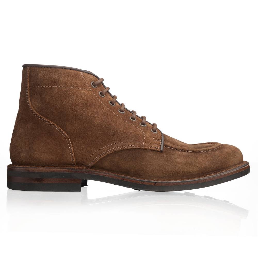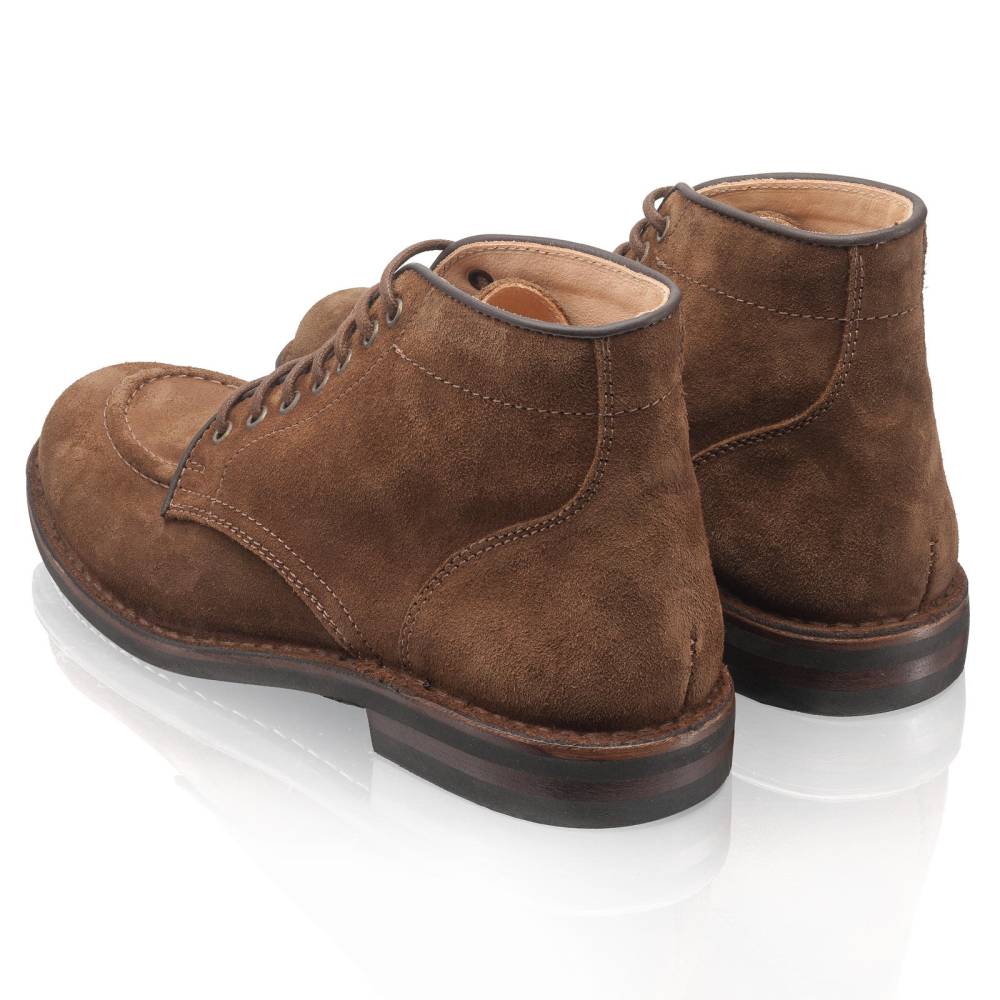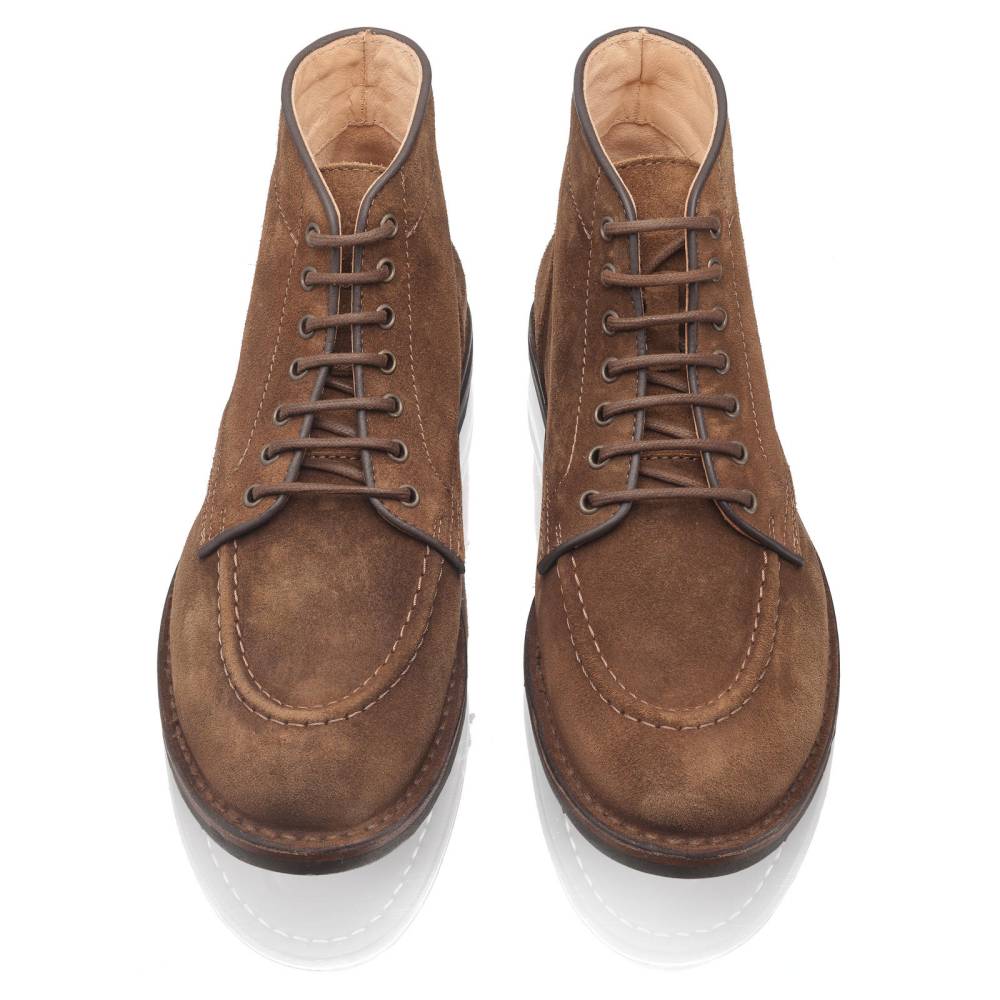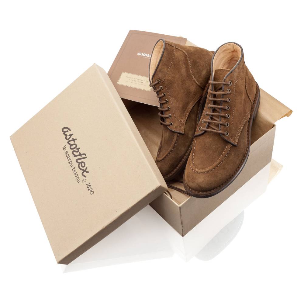 Культовые высокие мужские ботинки Nuvoflex итальянского бренда Astorflex c U-образной строчкой на мыске. Основное отличие от базового варианта — резиновая подошва вместо креповой. Верх выполнен из плотной тосканской замши коричневого цвета. Внутренняя отделка из гипоаллергенной кожи растительного дубления. Модель имеет мягкую кожаную стельку с пористым материалом снизу. Практичная резиновая подошва. Шнурки продеты через семь пар металлических люверсов. Пара сшита в прочной влагостойкой конструкции stitch-down (доппельный метод крепления).