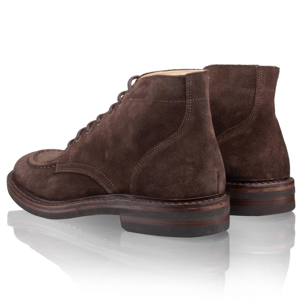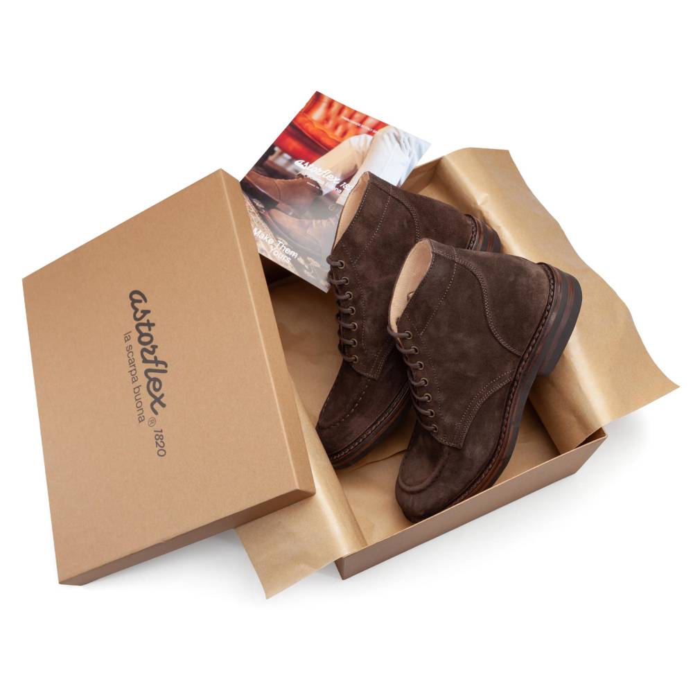 Культовые мужские ботинки Nuvoflex итальянского бренда Astorflex. Своим силуэтом и характерной U-образной строчкой на мыске (Moc Toe) модель повторяет легендарные «ботинки Индианы Джонса» — Indy Boots. Верх из плотной и эластичной тосканской замши тёмно-коричневого цвета, обработанной методом растительного дубления. Внутренняя отделка из гипоаллергенной кожи растительного дубления. Модель имеет съёмную стельку из кожи и пены с эффектом памяти (memory foam). Практичная резиновая подошва. Семь пар металлических люверсов. По окружности пришит штормовой рант который обеспечивает влагозащиту. Пара сшита в прочной влагостойкой конструкции stitch-down (доппельный метод крепления).