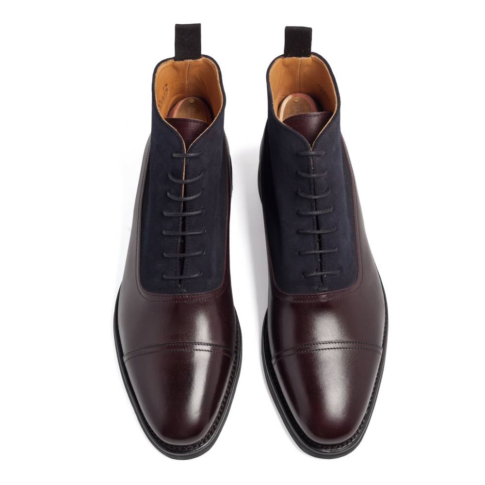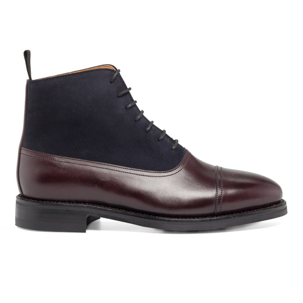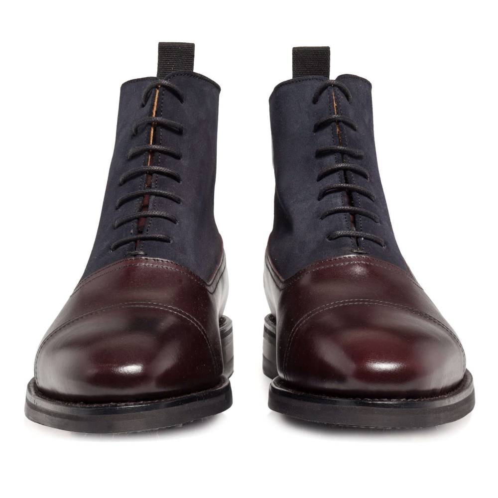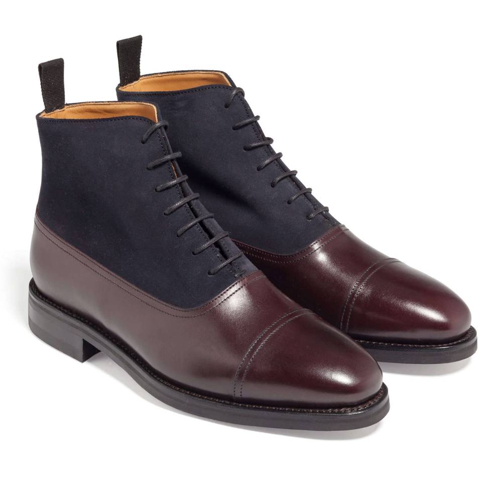 Двухцветные ботинки оксфорды с отрезным мысом испанского бренда Berwick. Модель представляет собой тип Balmoral Boots – разновидность классических ботинок, когда союзка уходит к пяточной части и подчеркивается диагональной строчкой. Верх модели выполнен из бордовой плотной седельной кожи (saddle calf leather) в сочетании с тёмно-синей замшей. Нижняя часть подошвы выполнена из износоустойчивой резины, благодаря чему ботинки остаются комфортными и влагонепроницаемыми в дождливую погоду. Конструкция Goodyear Welted.