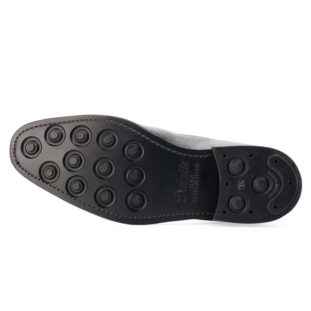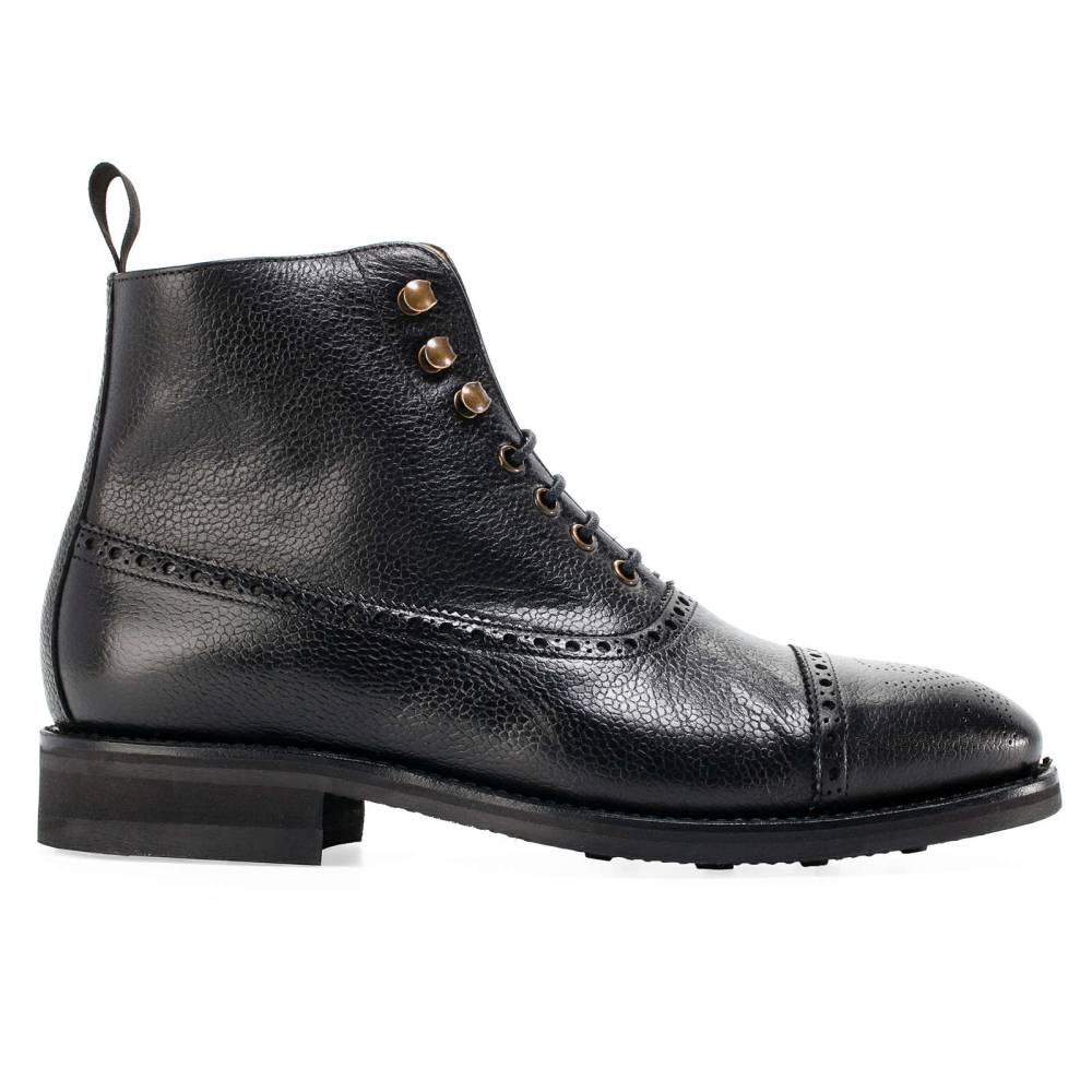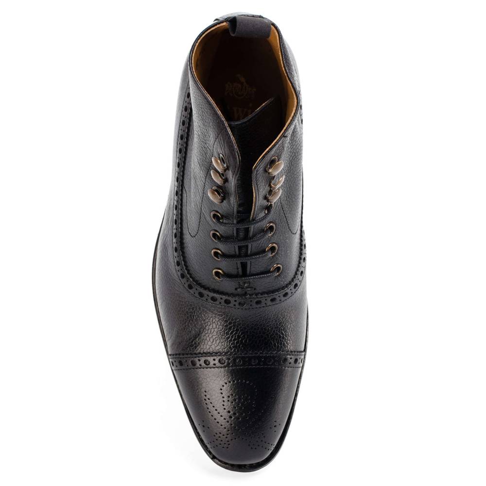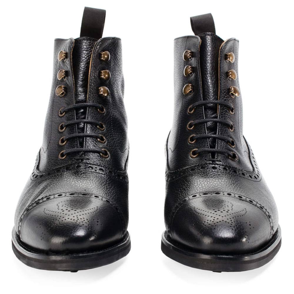 Мужские ботинки Berwick выполнены из плотной зернистой телячьей кожи чёрного цвета. Мыс украшен перфорированным узором в виде Весёлого Роджера. Нижний слой подошвы выполнен из прочной резины знаменитой британской фирмы Dainite. В верхней части шнурки завязываются крест-накрест при помощи металлических крючков. Ботинки отлично подойдут для осенней и весенней погоды. Конструкция Goodyear.