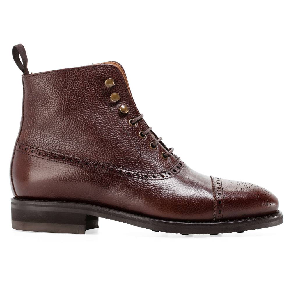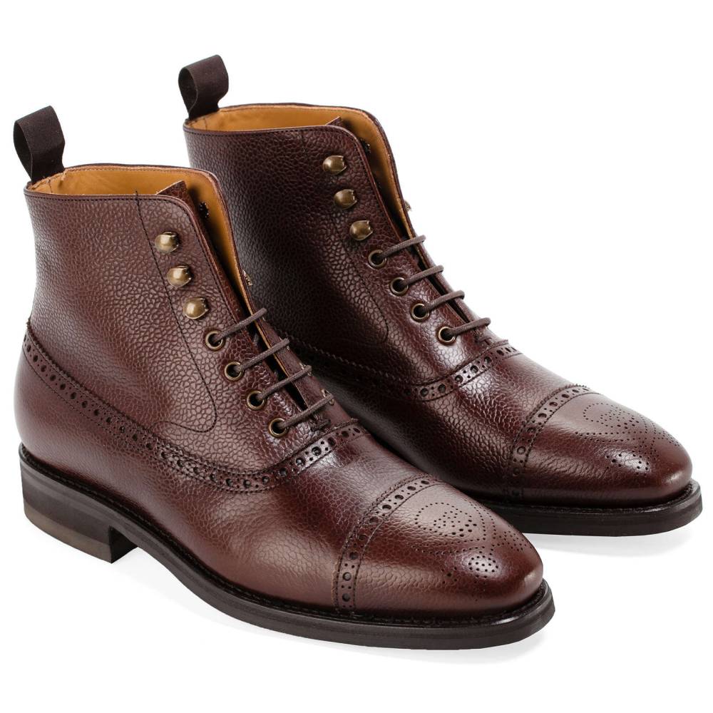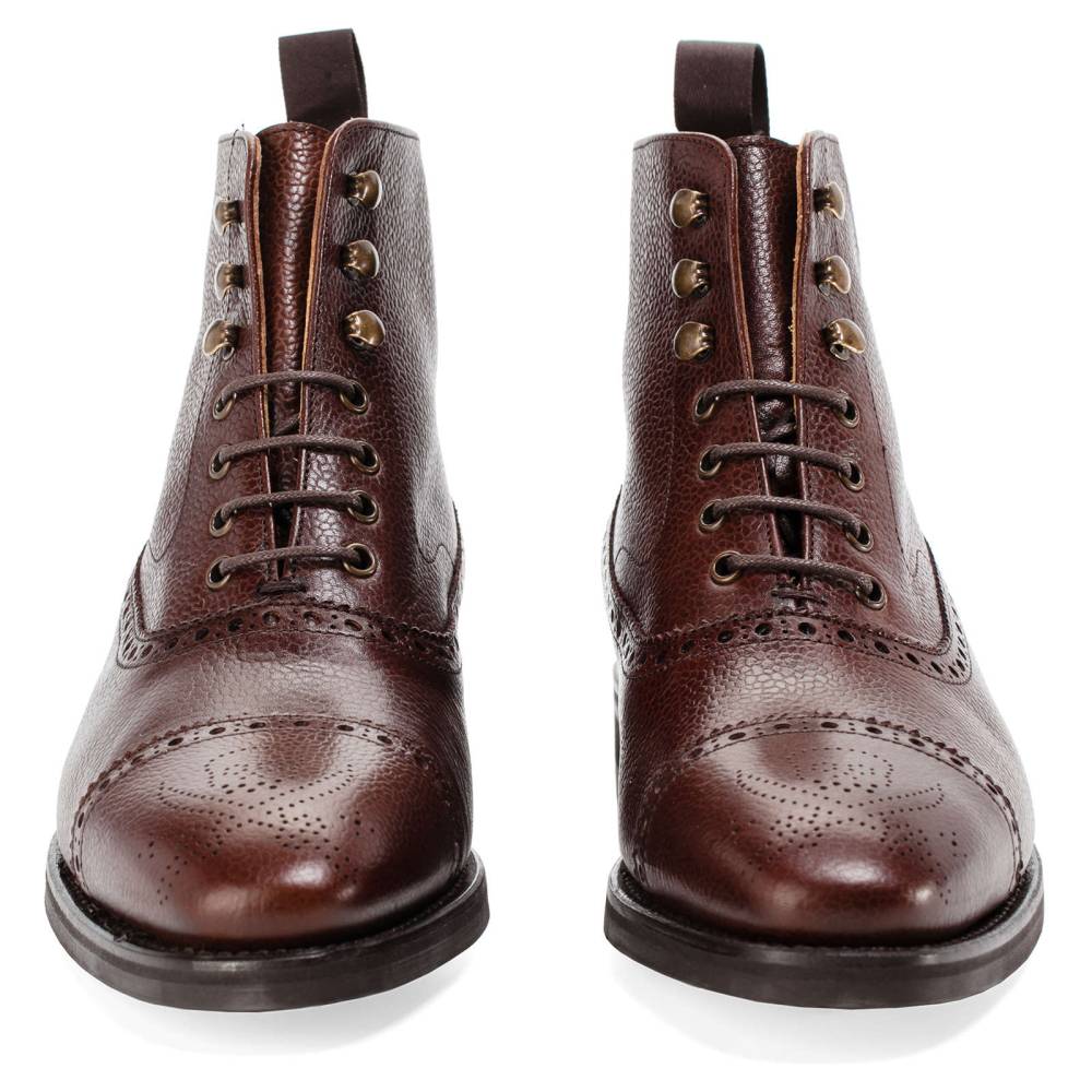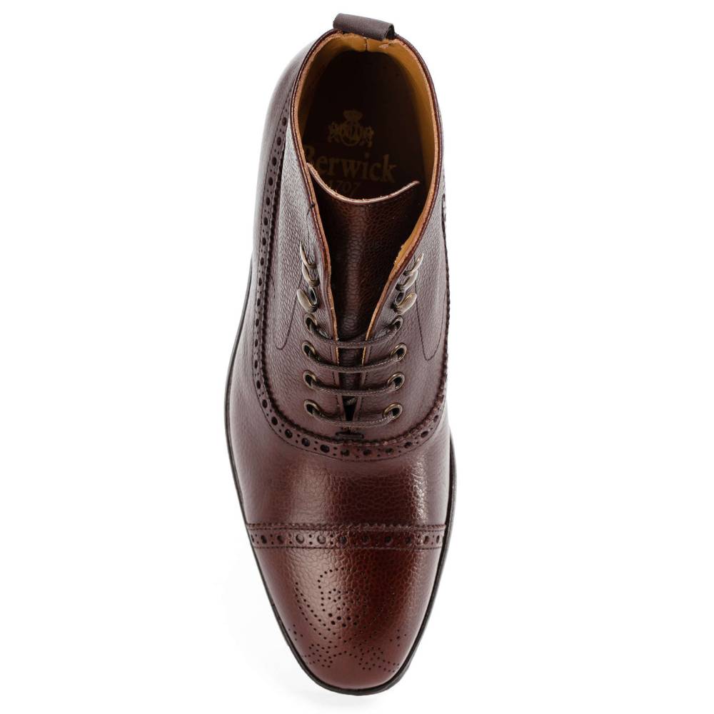 Мужские ботинки Berwick выполнены из плотной зернистой телячьей кожи коричневого цвета. Мыс украшен перфорированным узором в виде Весёлого Роджера. Нижний слой подошвы выполнен из прочной резины знаменитой британской фирмы Dainite. В верхней части шнурки завязываются крест-накрест при помощи металлических крючков. Ботинки отлично подойдут для осенней и весенней погоды. Конструкция Goodyear.