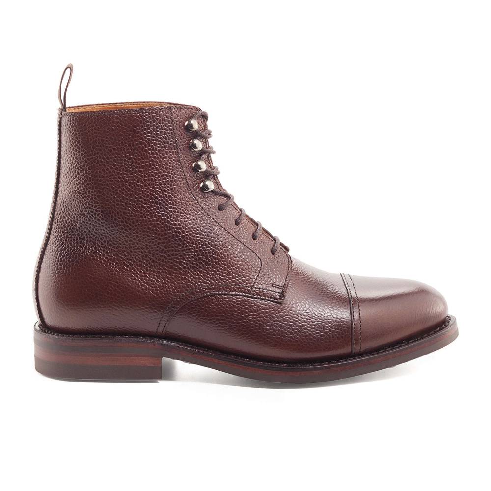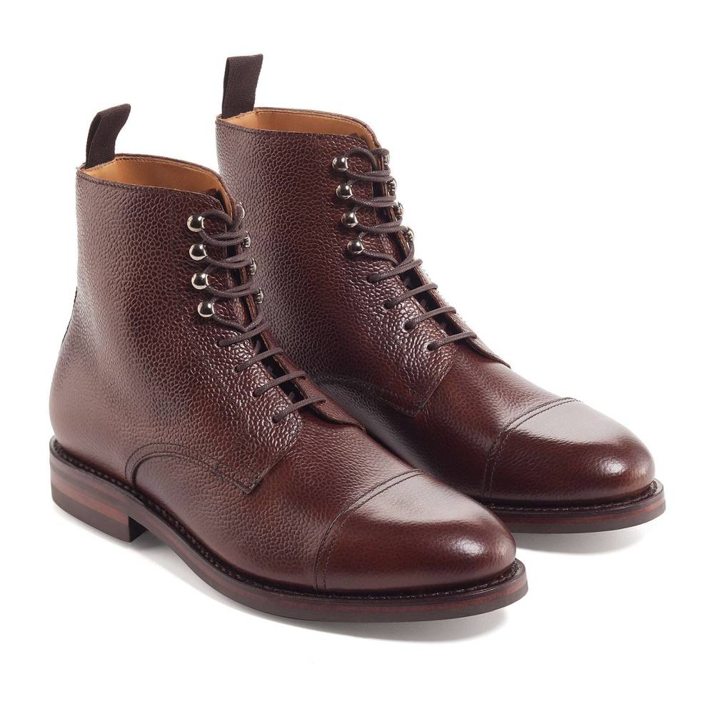 Ботинки дерби Berwick коричневого цвета на прочной резиновой подошве Dainite. Верх выполнен из плотной телячьей кожи с зернистой текстурой. В верхней части шнурки завязываются крест-накрест при помощи металлических крючков. Конструкция Goodyear Welted.