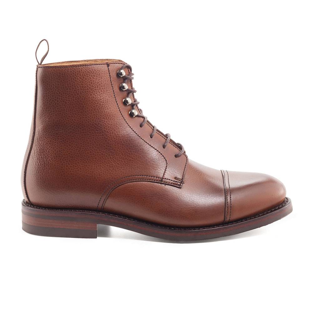 Ботинки дерби Berwick светло-коричневого цвета на прочной резиновой подошве Dainite. Верх выполнен из плотной телячьей кожи с зернистой текстурой. В верхней части шнурки завязываются крест-накрест при помощи металлических крючков. Конструкция Goodyear Welted.