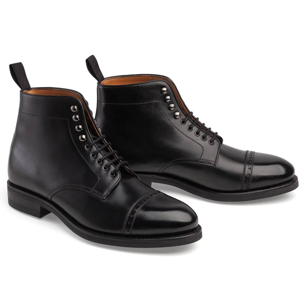 Мужские ботинки Berwick на подошве из прочной резины британской фирмы Dainite. Верх обуви выполнен из гладкой телячьей кожи чёрного цвета. Мыс декорирован перфорацией. В верхней части шнурки завязываются крест-накрест при помощи металлических крючков. Конструкция Goodyear Welted.