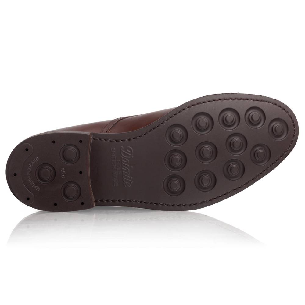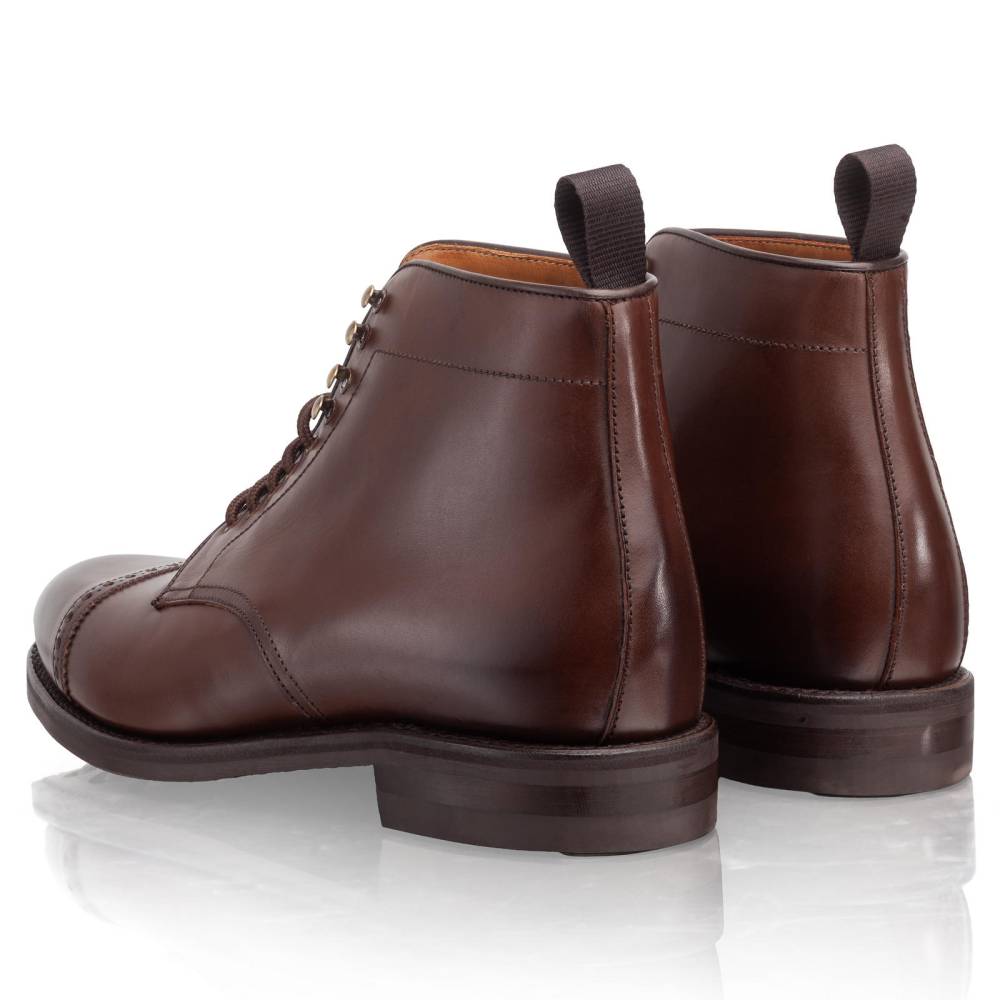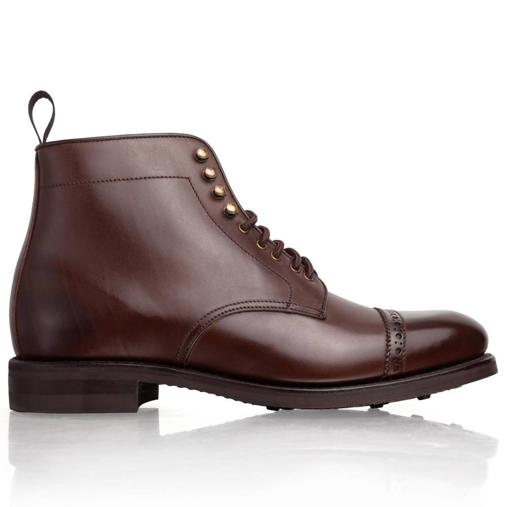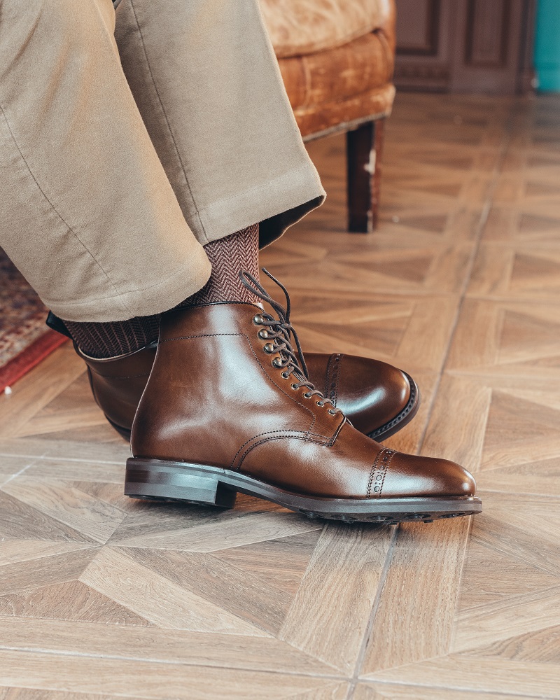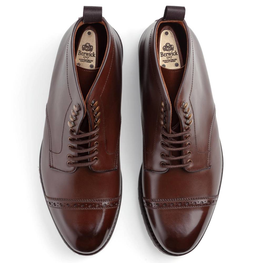 Мужские ботинки Berwick на подошве из прочной резины британской фирмы Dainite. Верх обуви выполнен из гладкой телячьей кожи растительного дубления коричневого цвета с лёгкой патиной на мысе и берцах. Мыс декорирован перфорацией. В верхней части шнурки завязываются крест-накрест при помощи металлических крючков. Конструкция Goodyear Welted.
