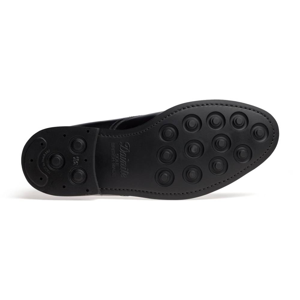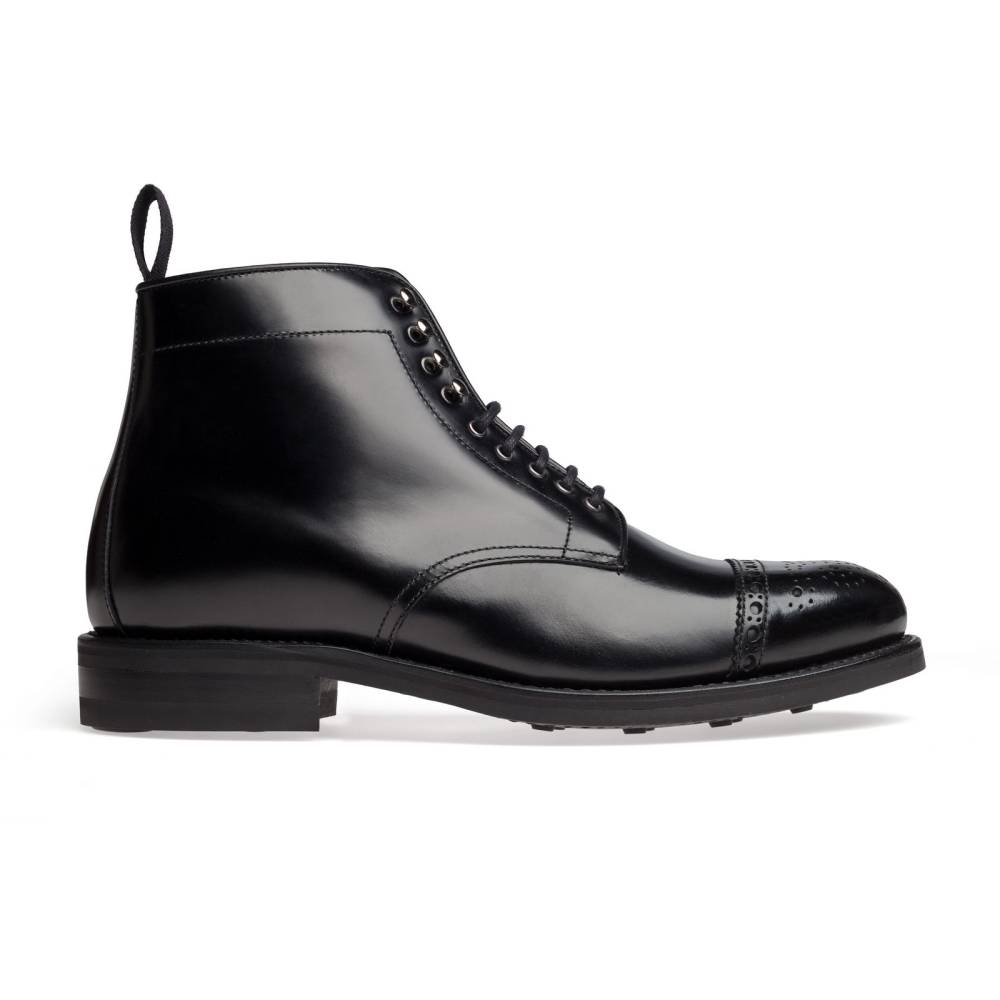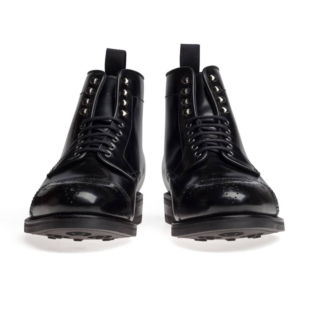 Чёрные ботинки дерби Berwick на прочной резиновой подошве Dainite. Верх выполнен из плотной полированной телячьей кожи. Внутренняя отделка, за исключением стельки, из густого натурального меха. Конструкция Goodyear Welted. Мыс декорирован традиционным медальоном. В верхней части шнурки завязываются крест-накрест при помощи металлических крючков. Конструкция Goodyear Welted.