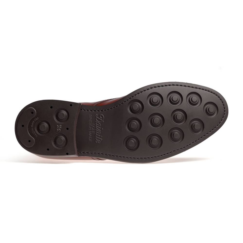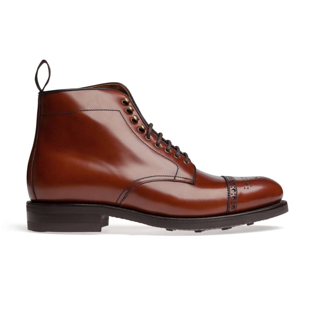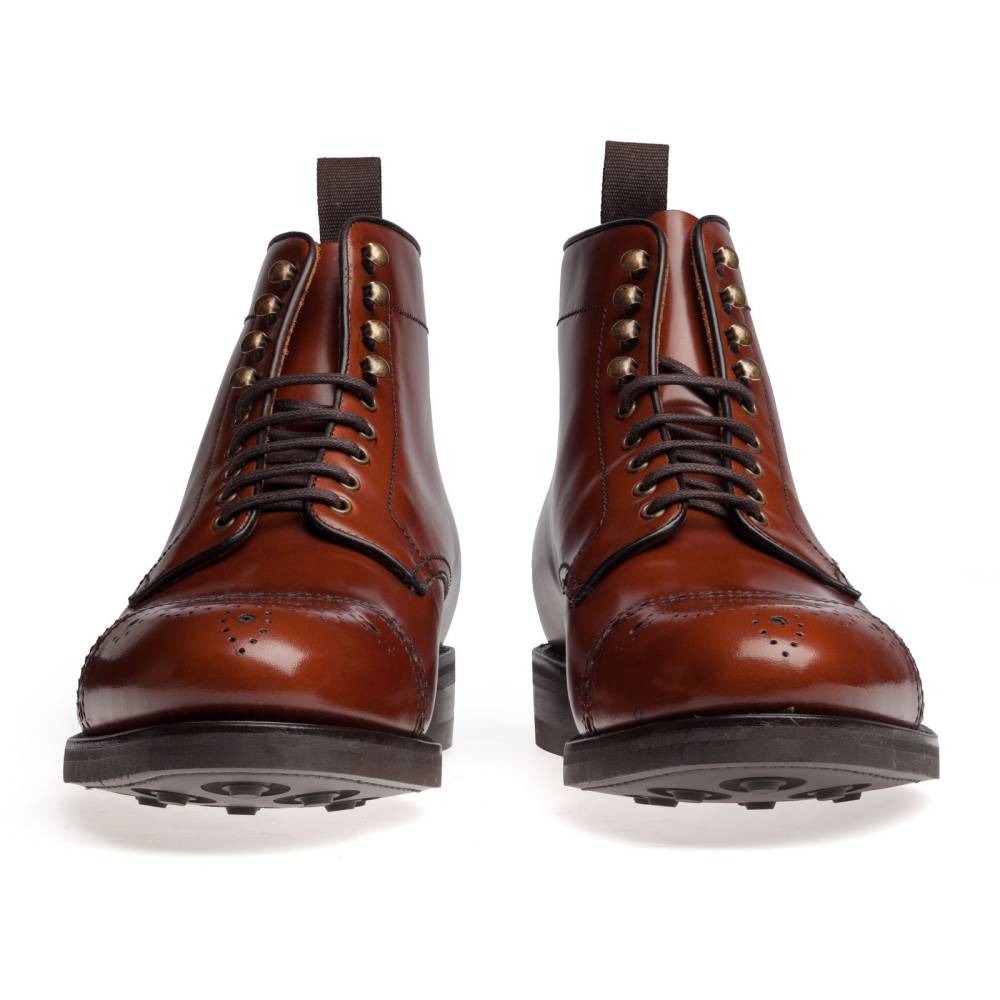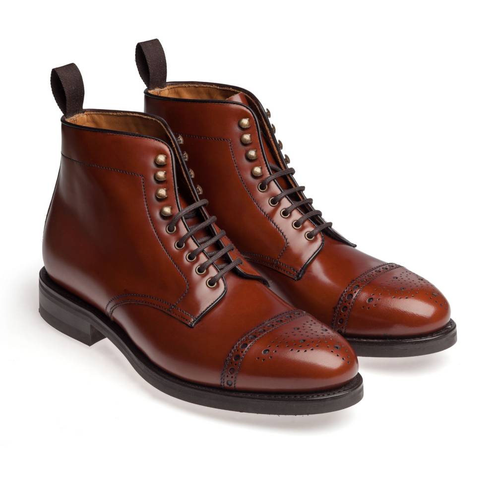 Ботинки дерби Berwick благородного коричневого цвета на прочной резиновой подошве Dainite. Верх выполнен из плотной полированной телячьей кожи. Конструкция Goodyear Welted. Мыс декорирован традиционным медальоном. В верхней части шнурки завязываются крест-накрест при помощи металлических крючков. Конструкция Goodyear Welted.