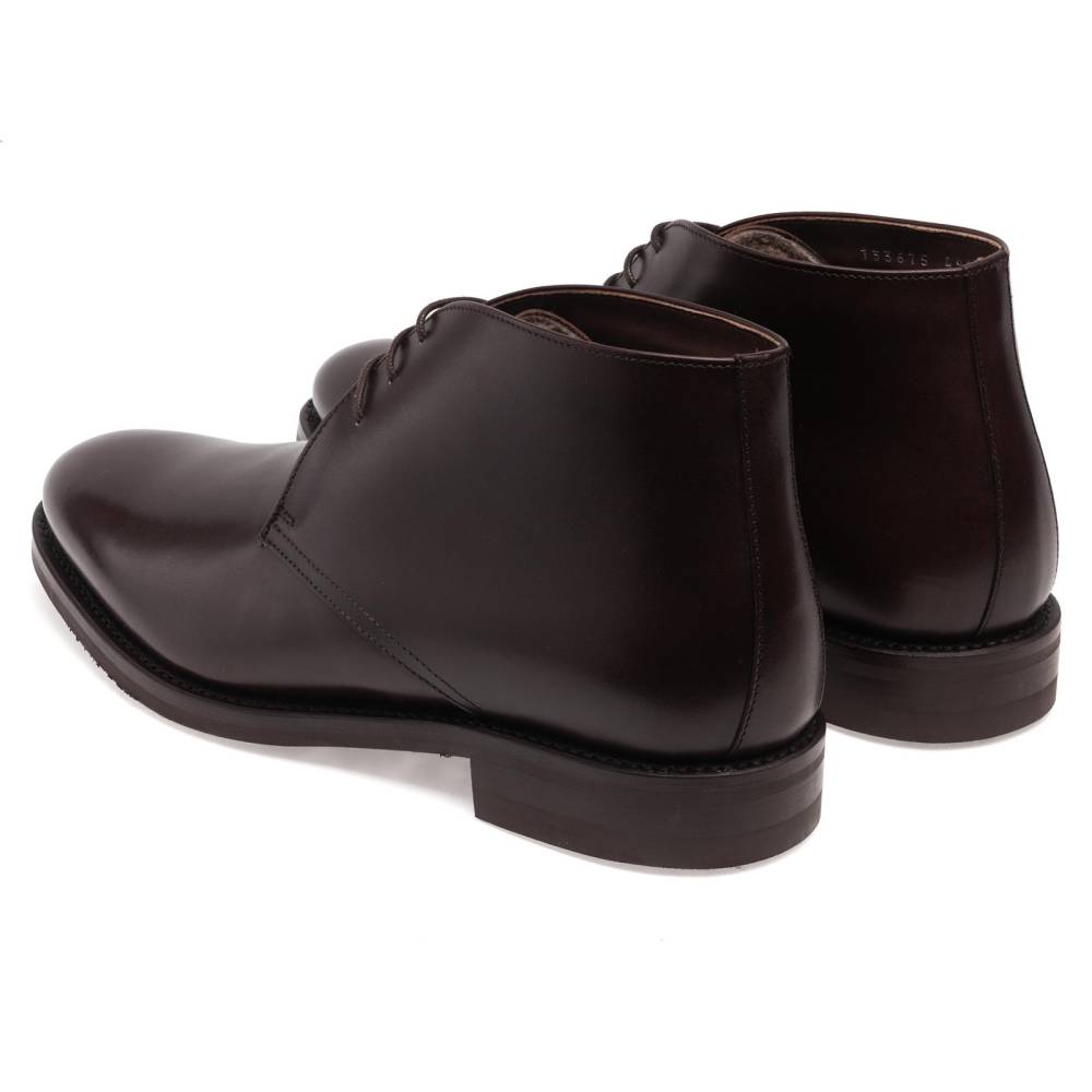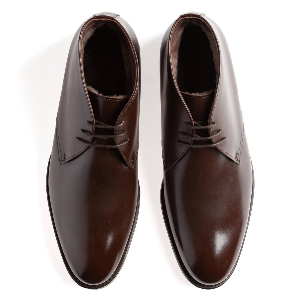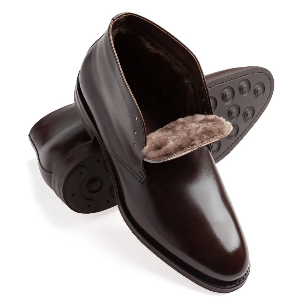 Классические ботинки чукка испанской марки Berwick на прочной резиновой подошве Dainite. Верх обуви выполнен из гладкой телячьей кожи тёмно-коричневого цвета. Внутренняя отделка, за исключением кожаной стельки, из густого натурального меха. Конструкция Goodyear Welted.
