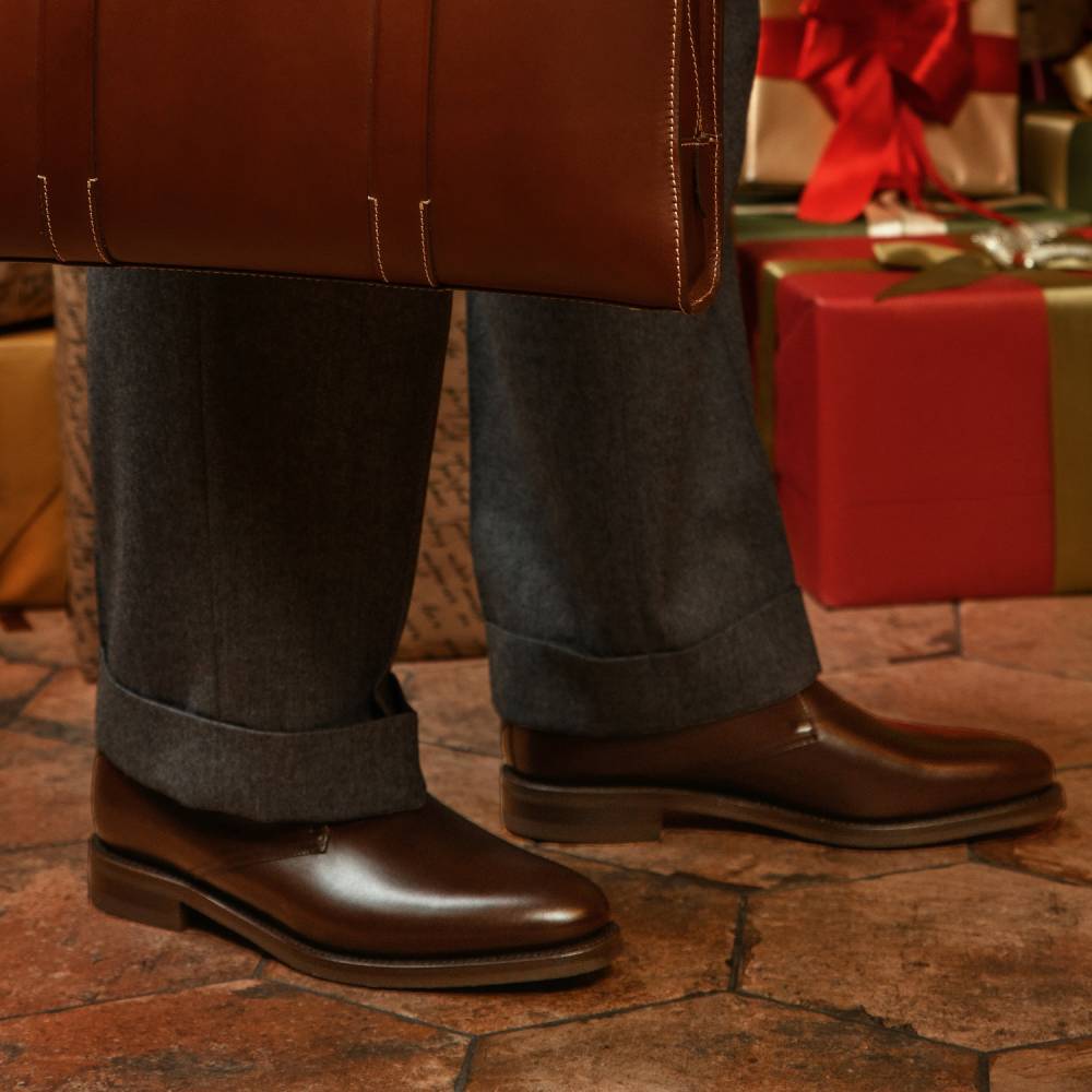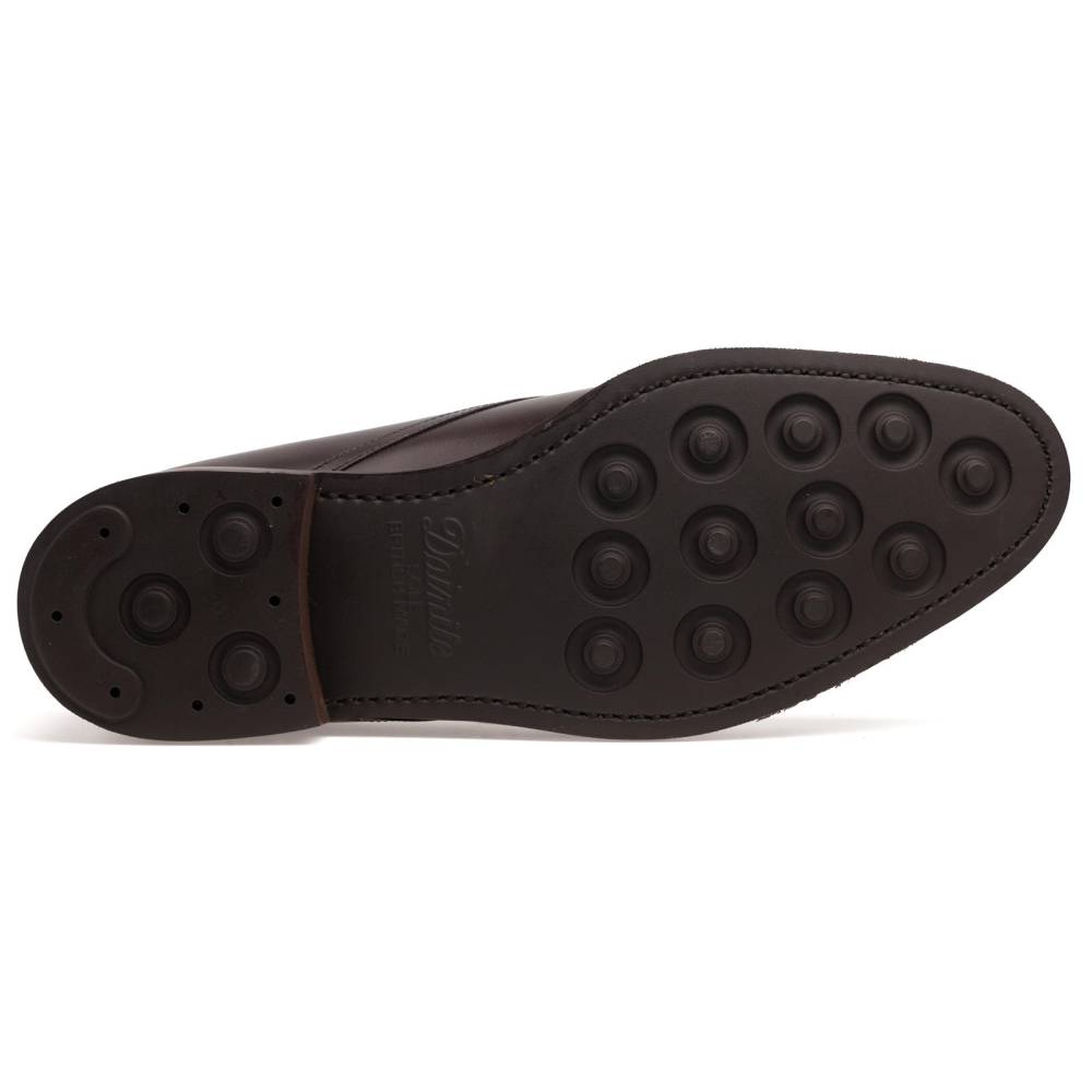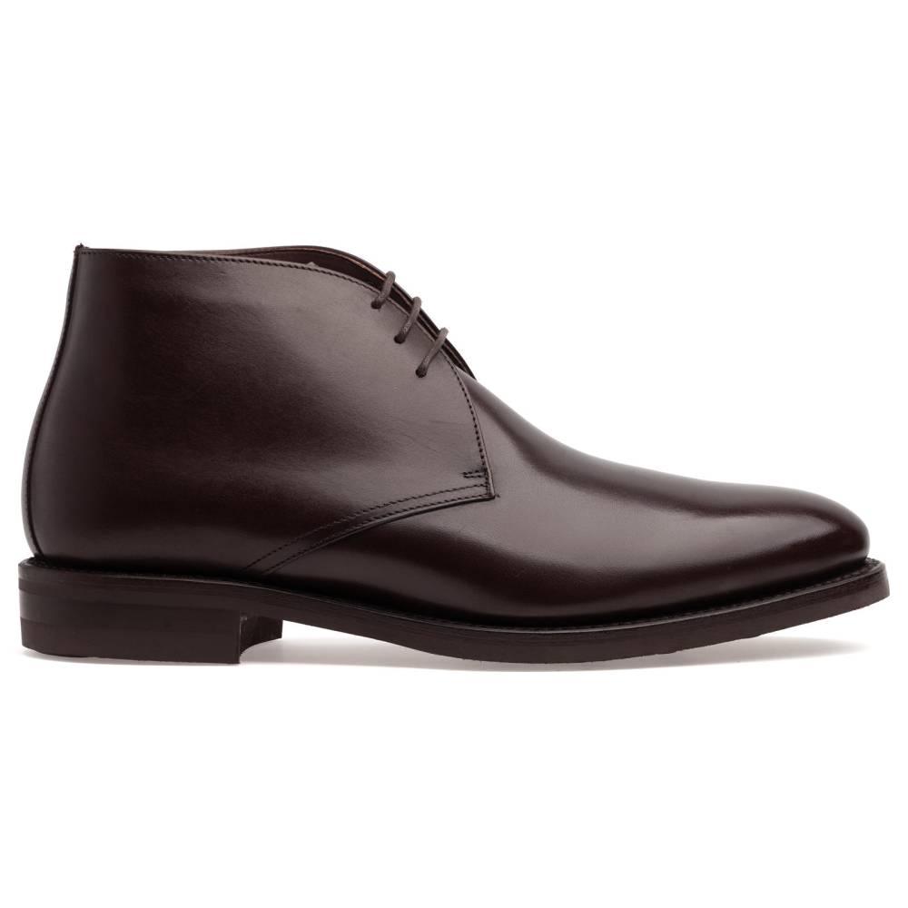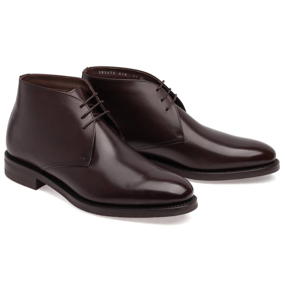 Классические ботинки чукка испанской марки Berwick на прочной резиновой подошве Dainite. Верх обуви выполнен из гладкой телячьей кожи тёмно-коричневого цвета. Внутренняя отделка, за исключением кожаной стельки, из густого натурального меха. Конструкция Goodyear Welted.