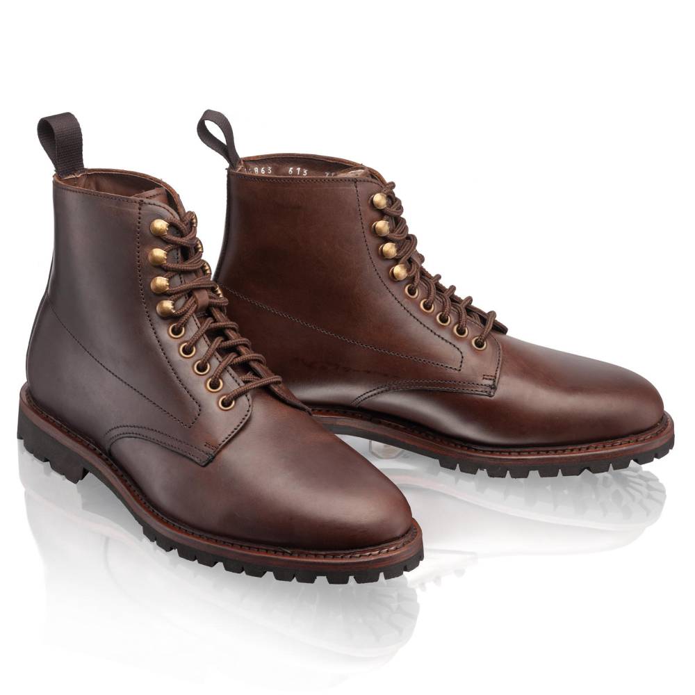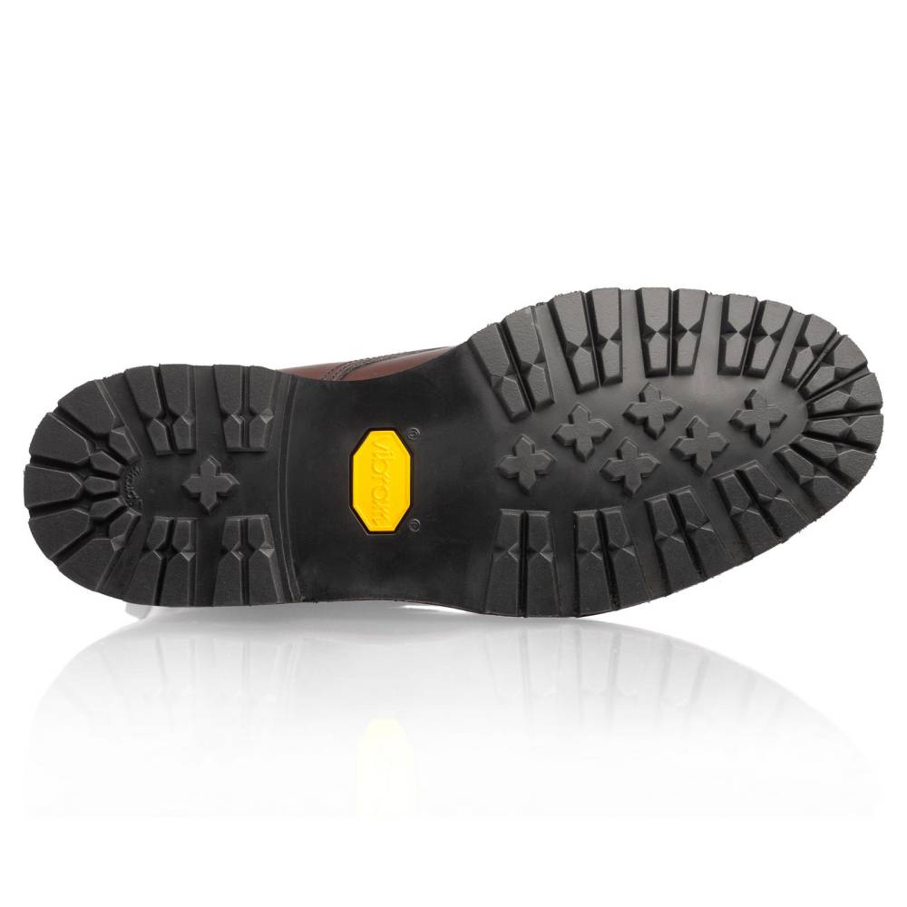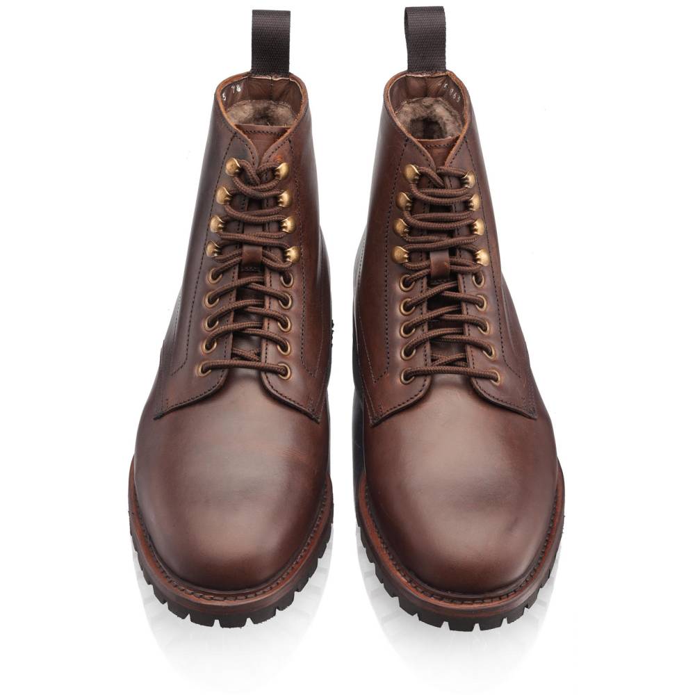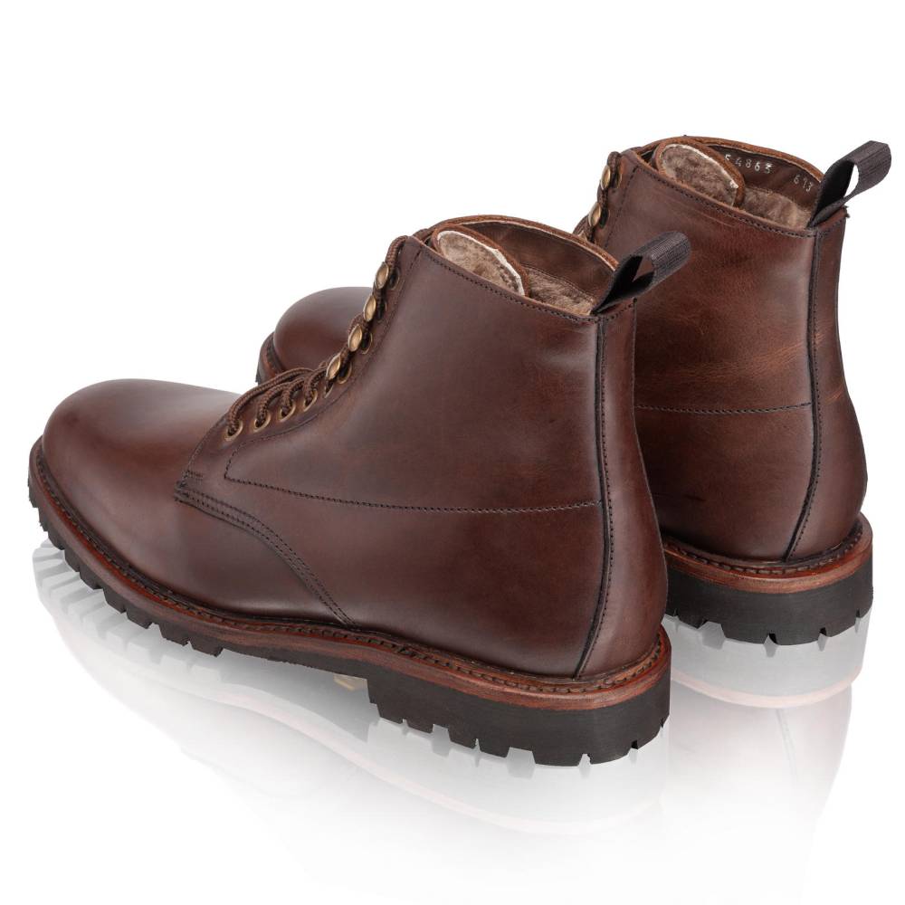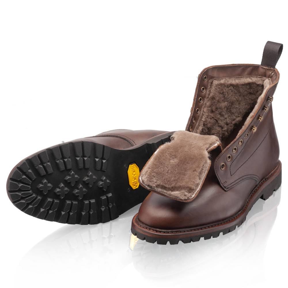 Тёплые мужские ботинки испанской фирмы Berwick для длительных прогулок в холодную погоду. Верх обуви выполнен из плотной жированной телячьей кожи. Такая кожа обладает устойчивостью к влаге и неприхотлива в уходе. Функциональной особенностью модели является прочная резиновая подошва с глубоким протектором Vibram Montana, прошитая по всей окружности. Внутренняя отделка за исключением стельки выполнена из натурального меха (овчина). Модель имеет усиленный рант с окантовкой (storm welt), который добавляет подошве дополнительную защиту от влаги. Конструкция Goodyear Welted.