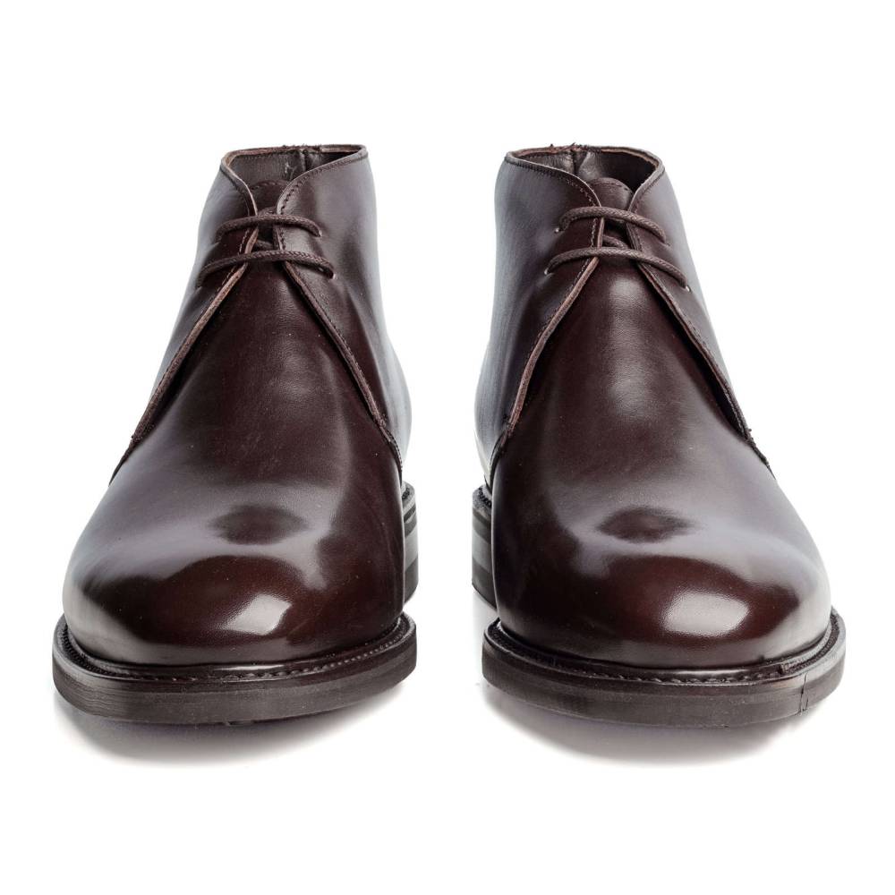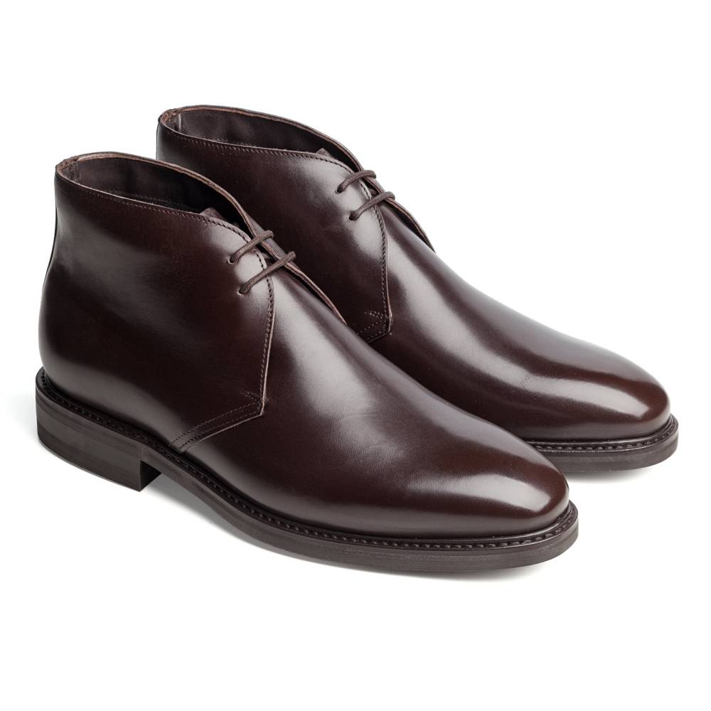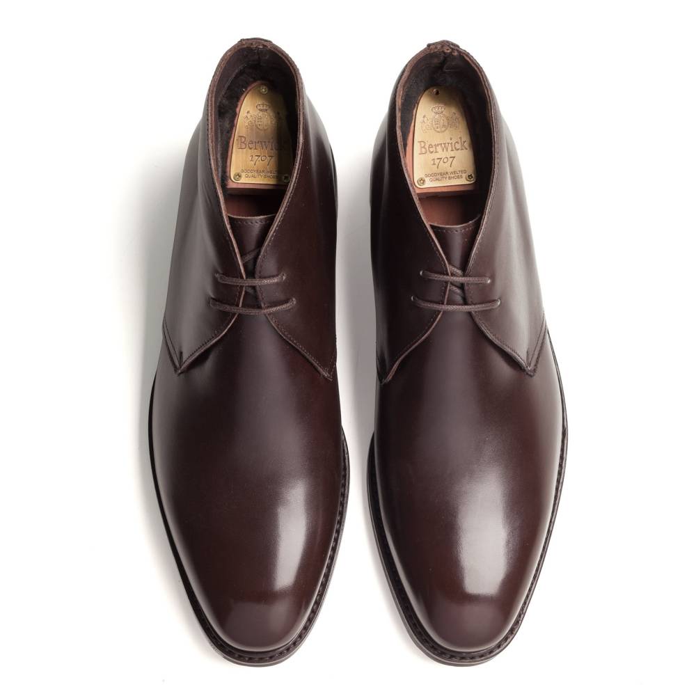 Классические ботинки чукка Berwick на подошве из прочной резины британской фирмы Dainite. Верх обуви выполнен из гладкой телячьей кожи тёмно-коричневого цвета. Внутренняя отделка, за исключением стельки, из густого натурального меха. Конструкция Goodyear Welted.