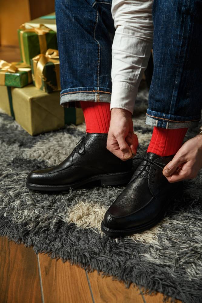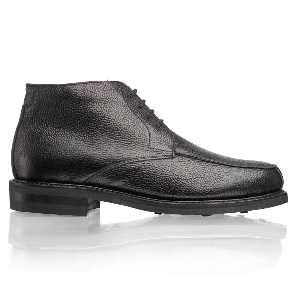 Тёплые мужские ботинки испанской фирмы Berwick для холодной погоды и длительных прогулок. Верх обуви выполнен из плотной телчьей кожи с зернистой фактурой чёрного цвета. Внутренняя отделка за исключением стельки выполнена из натурального меха (овчина). Функциональной особенностью модели является прочная резиновая подошва Dainite, прошитая по всей окружности, а эстетической – так называемый норвежский мыс (он же – split toe). Модель имеет усиленный рант с окантовкой (storm welt), который добавляет подошве дополнительную защиту от влаги. Конструкция Goodyear Welted.