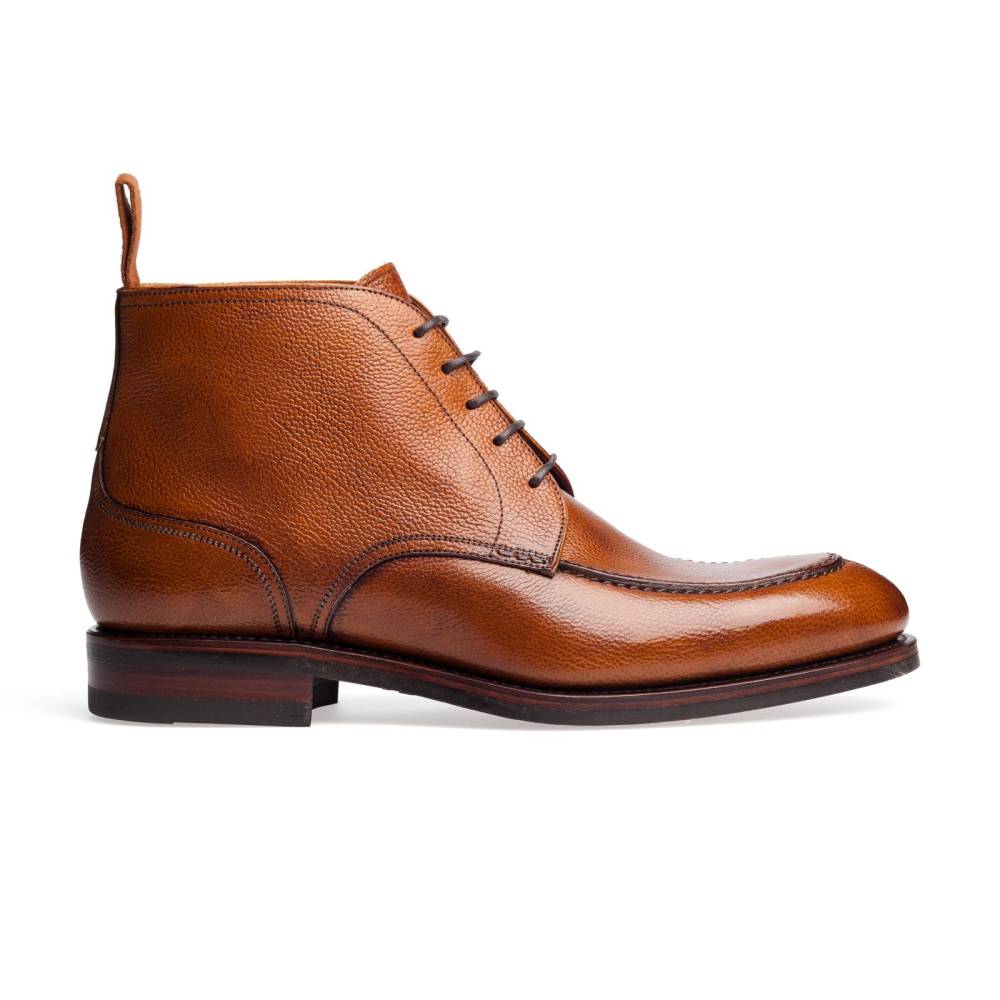 Повседневные демисезонные ботинки Carmina Shoemaker на резиновой подошве. Модель представляет собой ботинки в норвежском стиле с тремя сшитыми элементами в передней части (split toe boots). Для верха иcпользовалась высококачественная телячья кожа светло-коричневого цвета с зернистой текстурой. Финишная обработка кожи «антикинг» добавляет характерные градиентные переходы на поверхности от более тёмных оттенков к светлым. Конструкция Goodyear Welted.