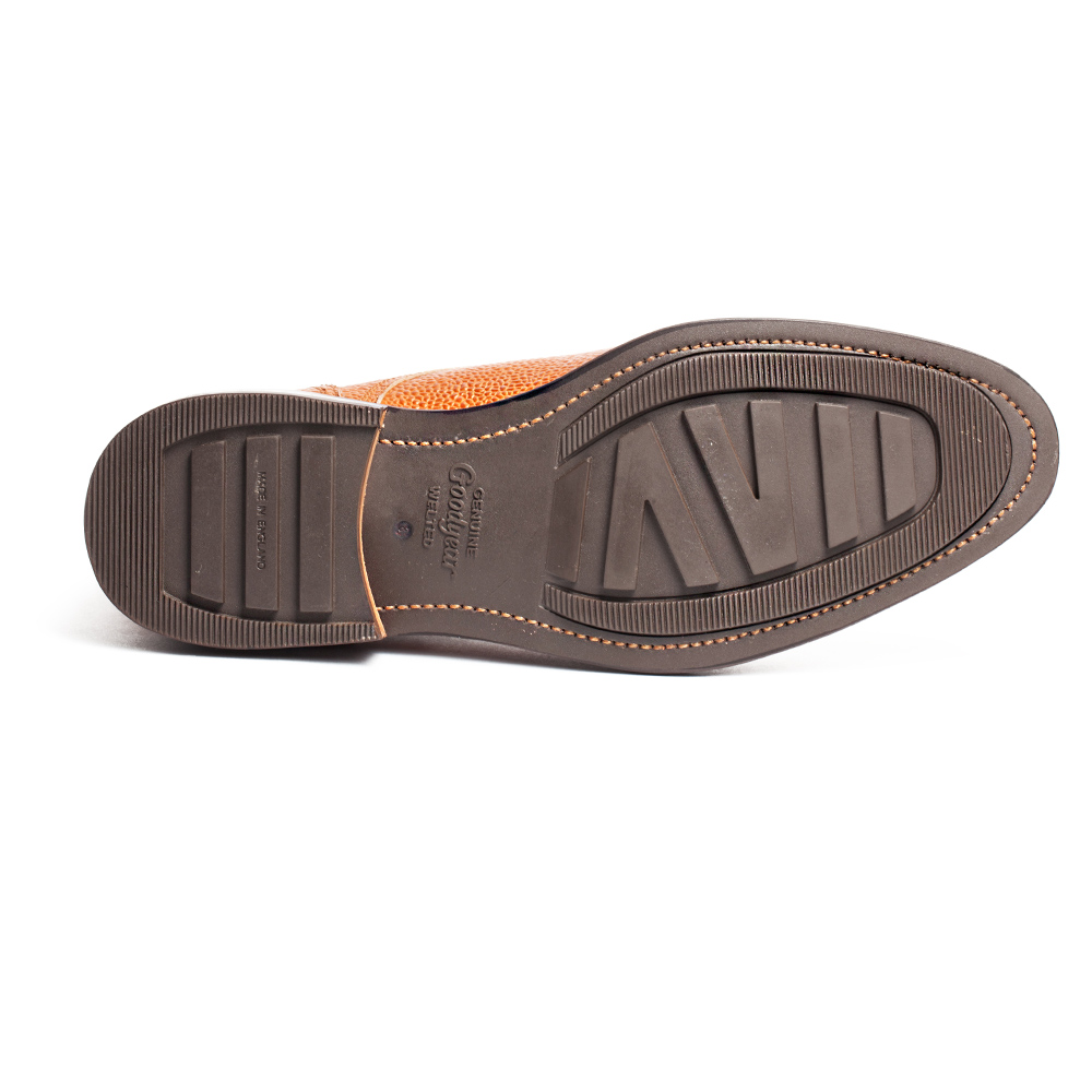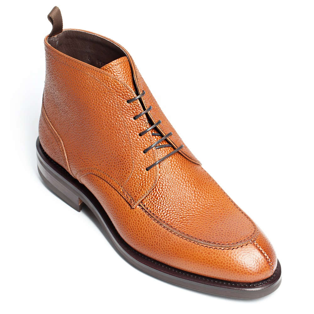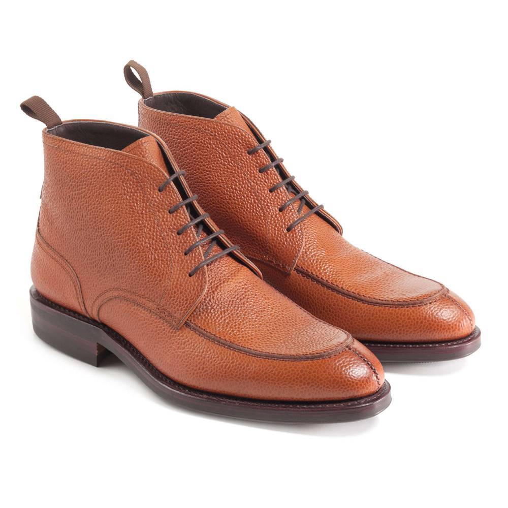 Высокие ботинки Carmina в норвежском стиле из плотной зернистой телячьей кожи светло-коричневого цвета. Внутренняя отделка из тонкой ярко-оранжевой кожи. На нижнюю часть подошвы установлена прочная ребристая резина Victory. Конструкция Goodyear.