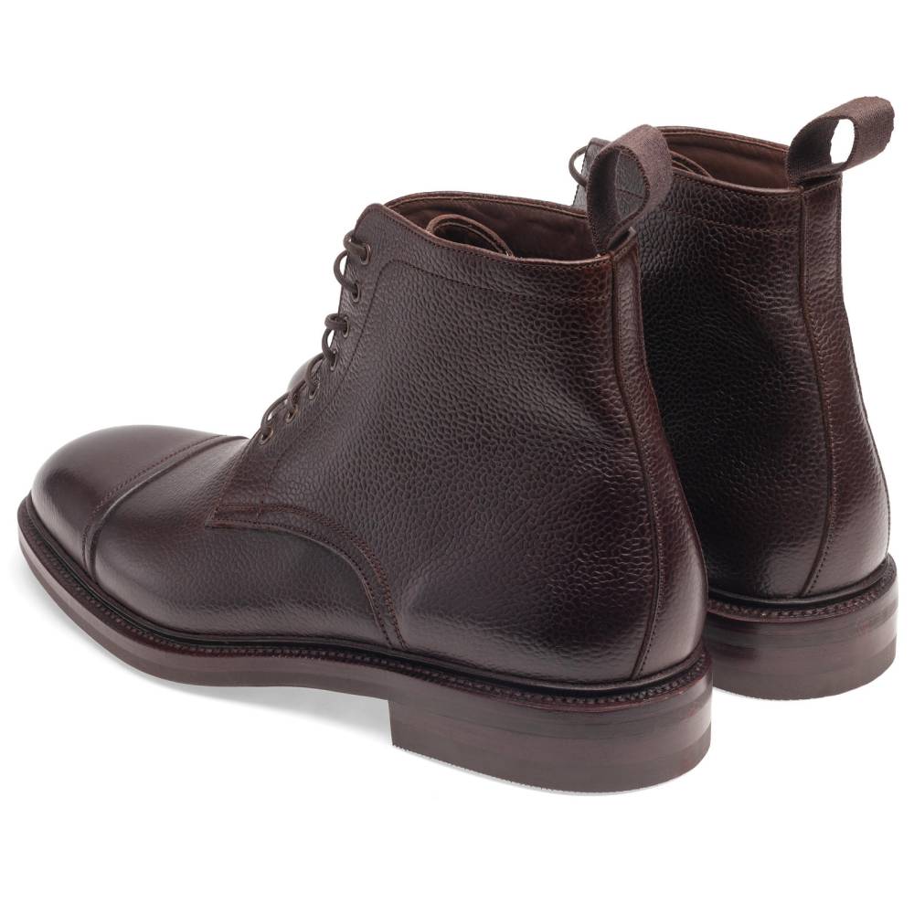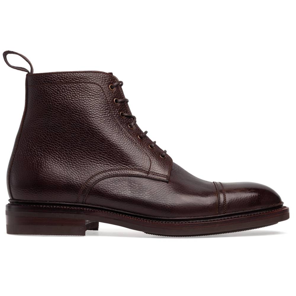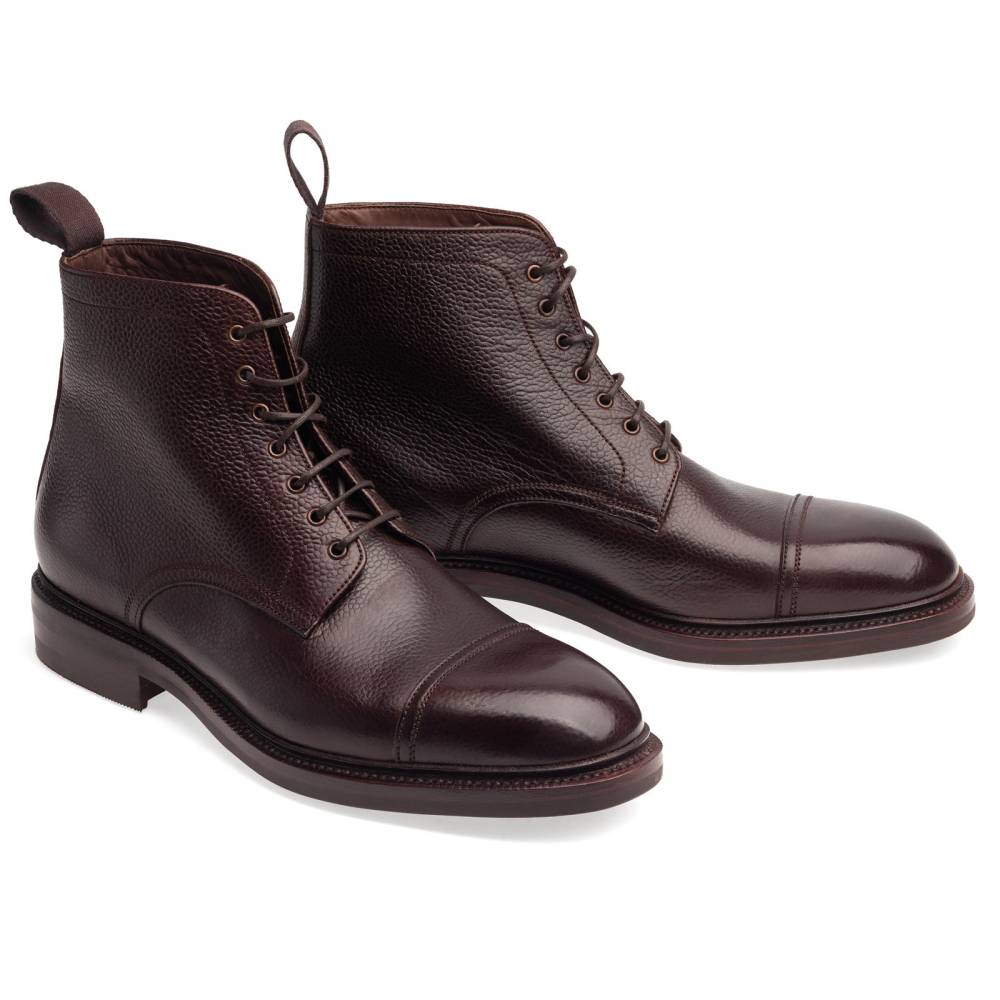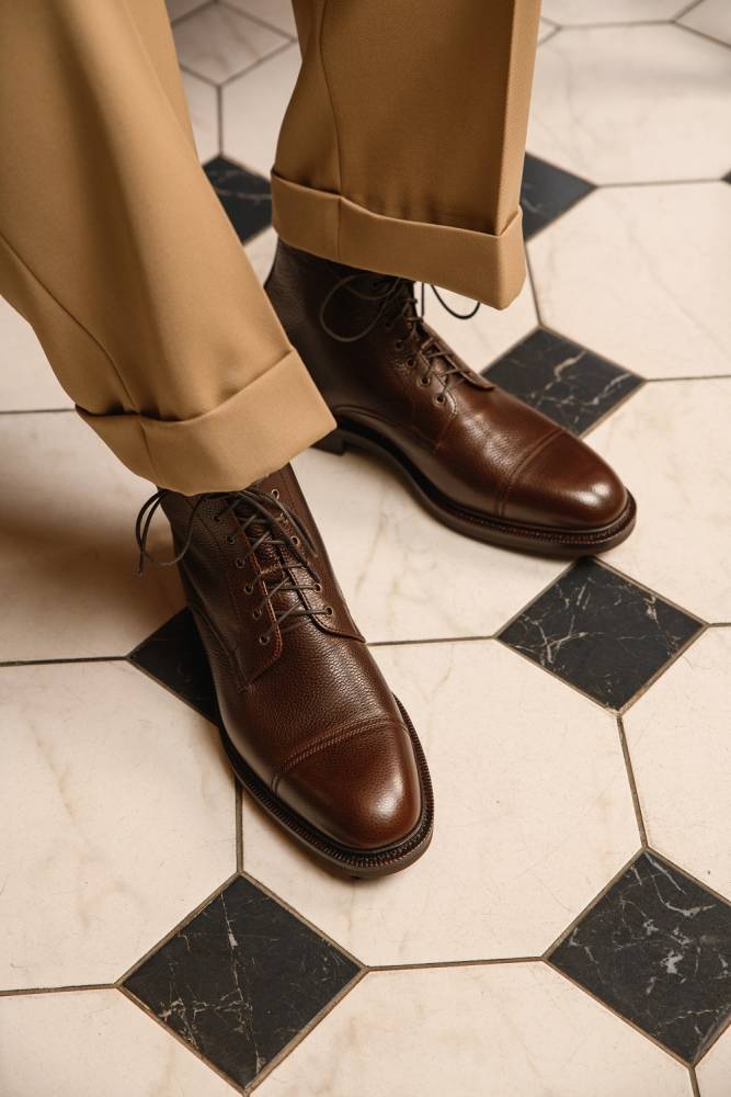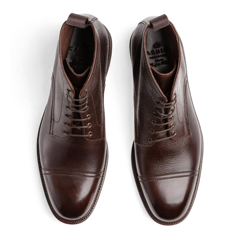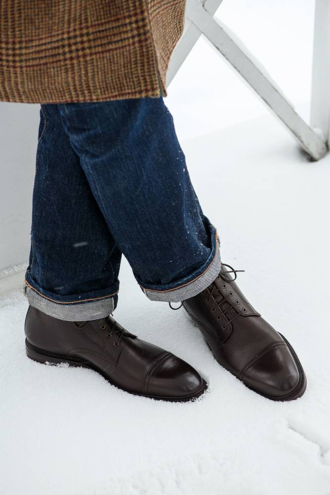 Повседневные высокие мужские ботинки Carmina изготовлены по специальному заказу (МTO) для магазина Checkroom. Модель является адаптированной версией военных десантных прыжковых ботинок (англ. Jumper boots). Характерными чертами таких ботинок являются высокая шнуровка с люверсами, резиновая подошва с протектором и отрезной мысок. В исполнении фабрики Carmina модель выполнена из мягкой тёмно-коричневой телячьей кожи с зернистой фактурой, имеет прочную резиновую подошву Victory с промежуточным кожаным слоем и штормовой рант. Конструкция Goodyear Welted.